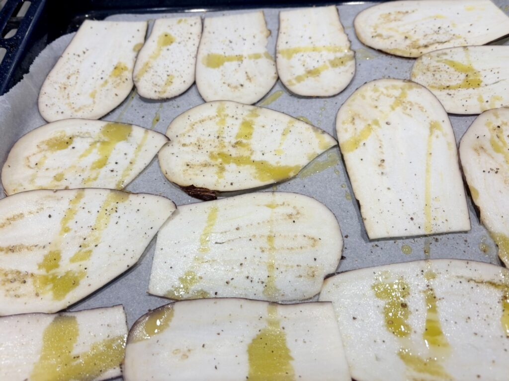 Affettate sottilmente la melanzane , dispone le fette in una teglia da forno e conditele con un filo di olio, sale e pepe.