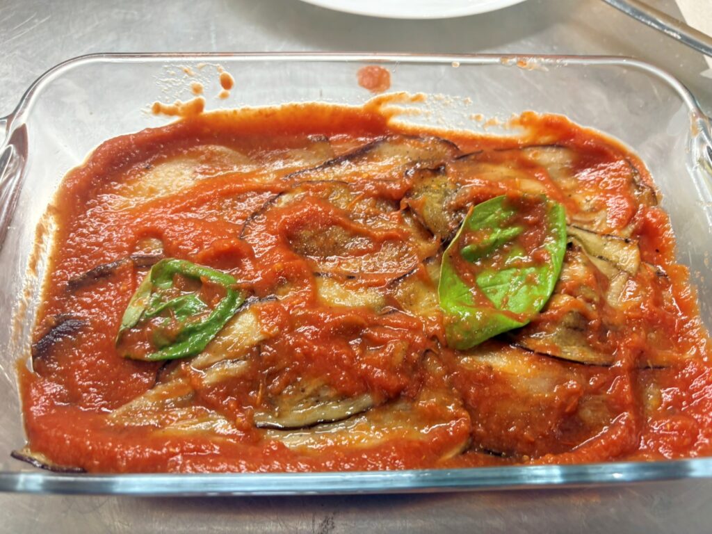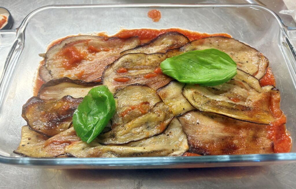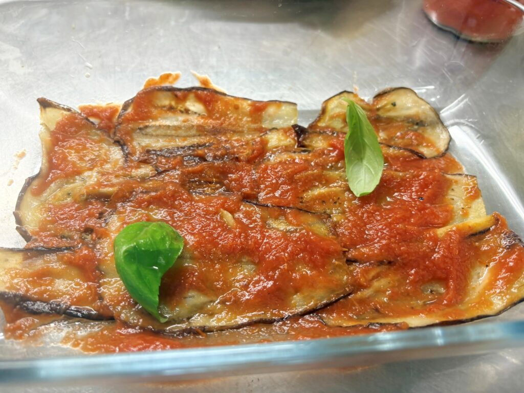 In una teglia separata , disponete meta’ delle fette di melanzane cotte e copritele con metà della passata e con 2 foglie di basilico.