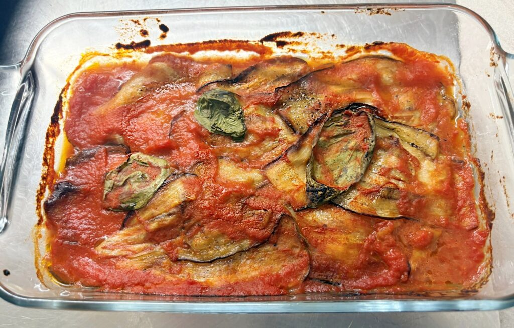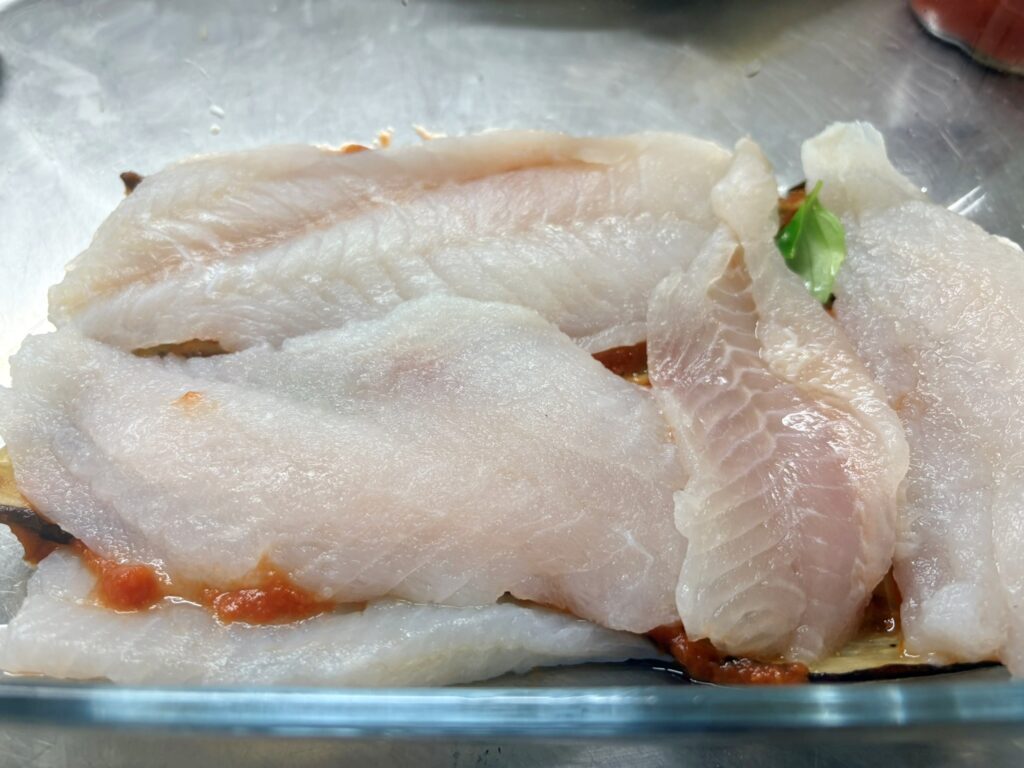 Aggiungete i filetti di cernia e copriteli con le restanti melanzane, la passata e il basilico.