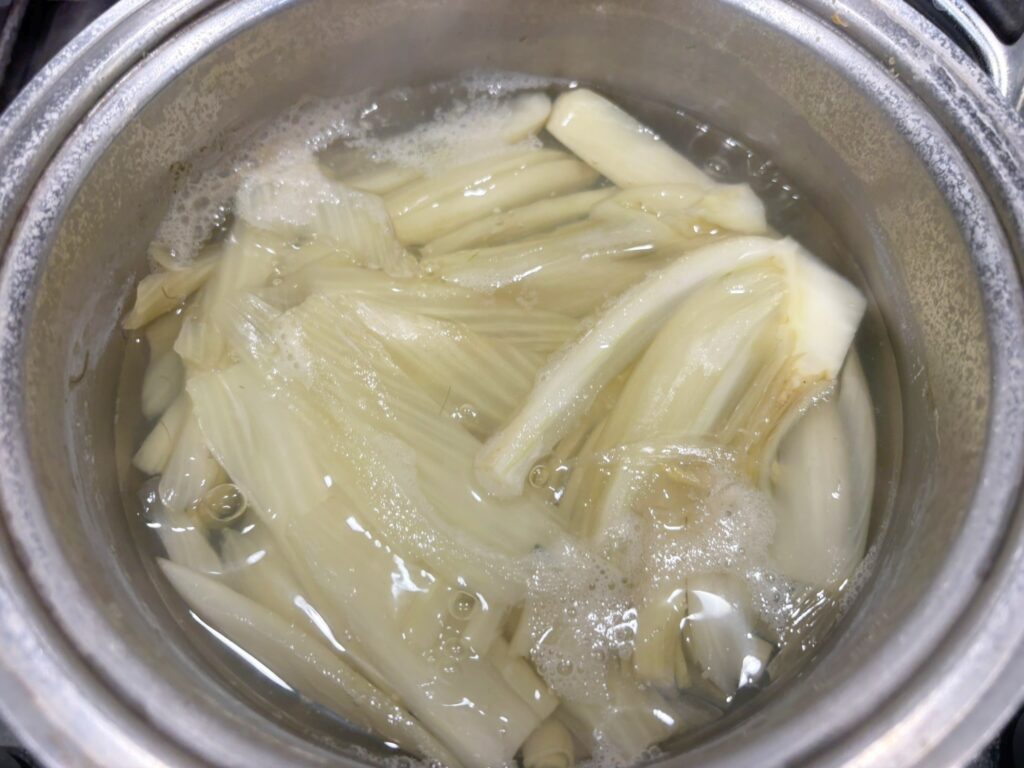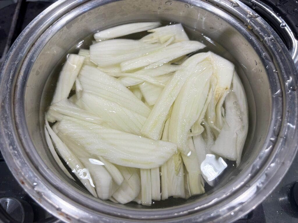 Pulite e lavate bene i finocchi , eliminate le foglie esterne , tagliateli a fettine e lessateli 10 minuti in acqua bollente leggermente salata.