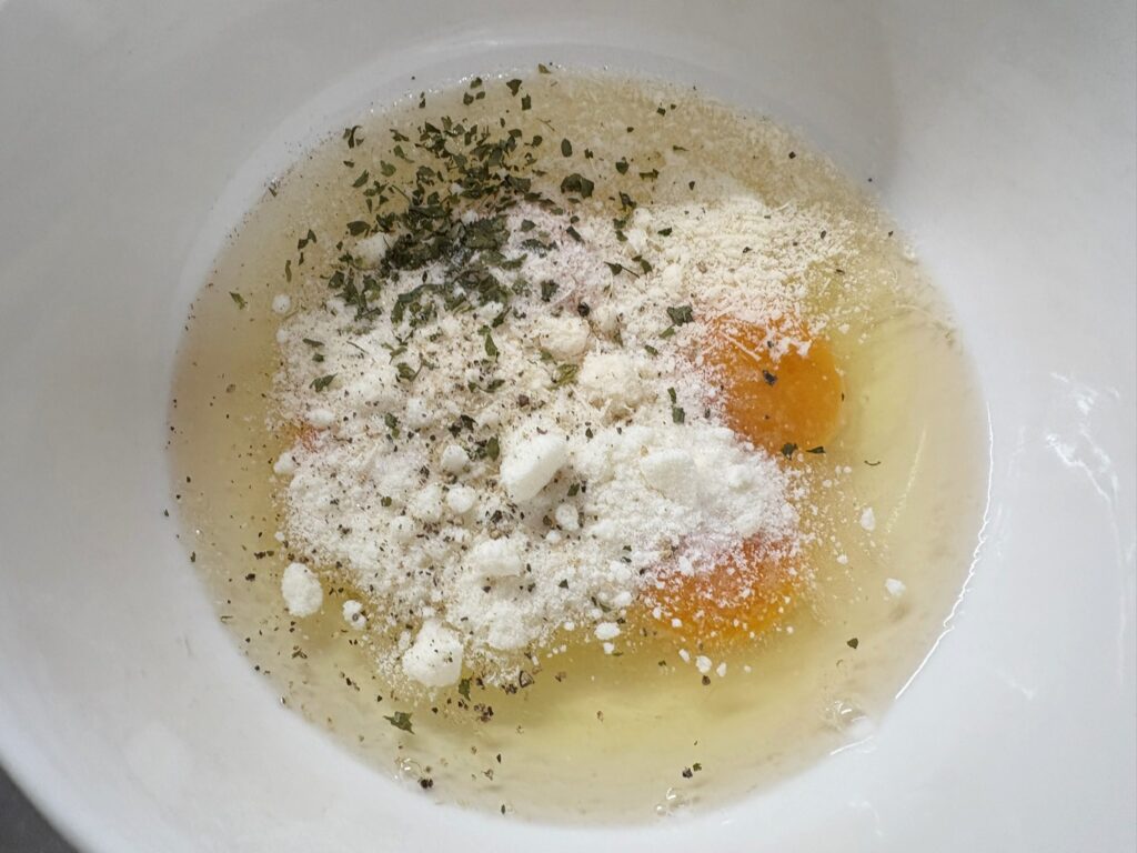 Mettete in una ciotola le uova , il sale e il pepe , il formaggio , il latte, l’origano e mescolate .
