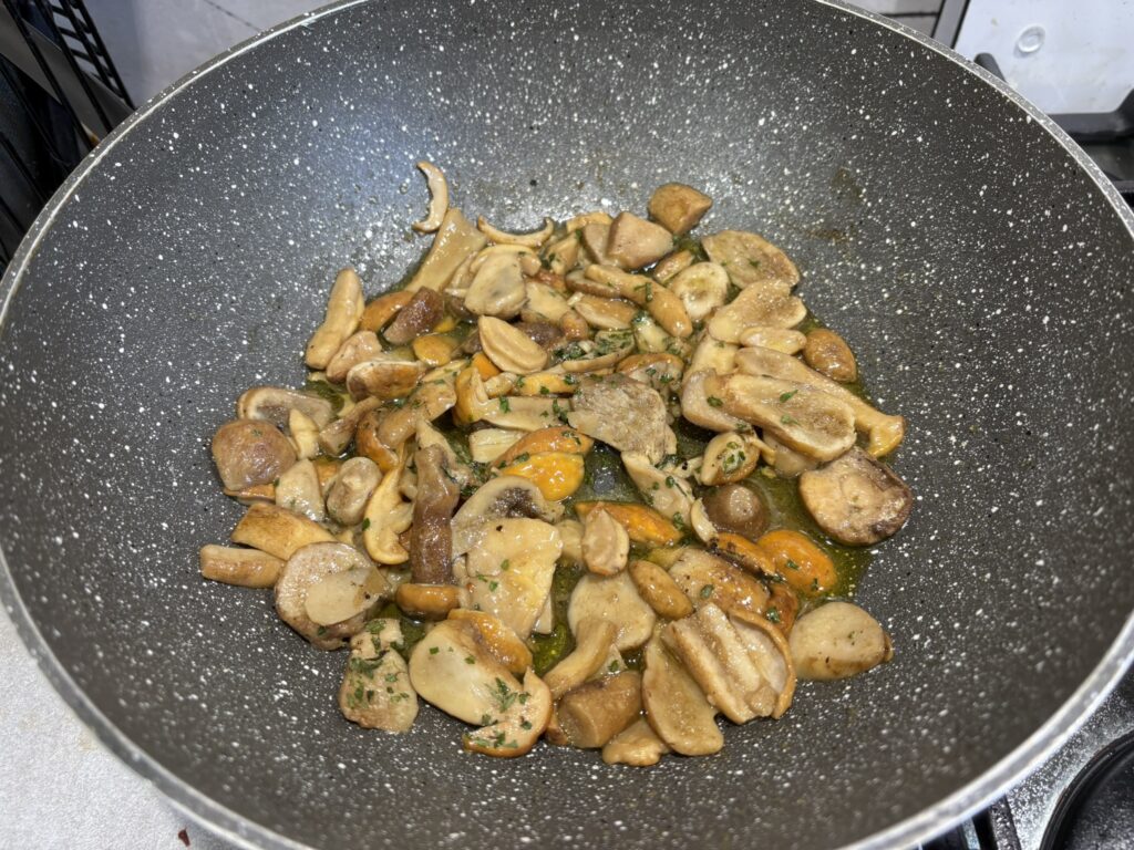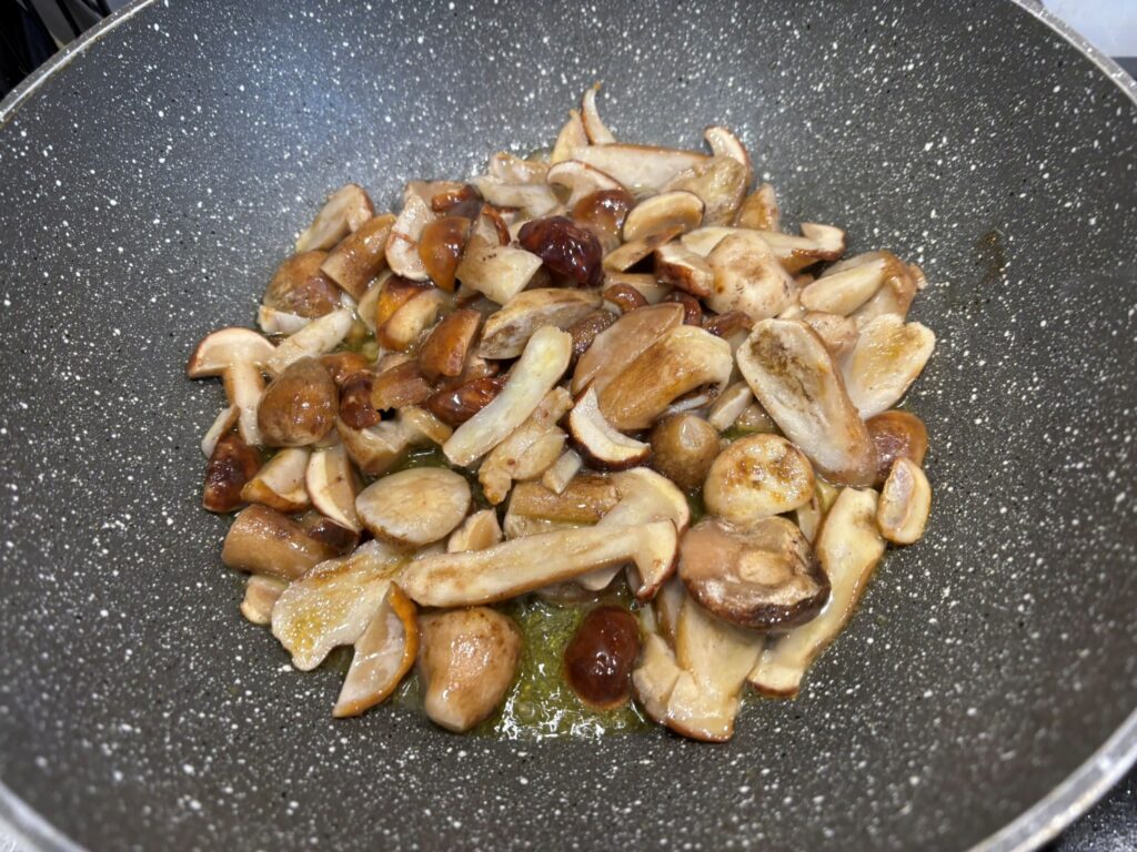 In una padella capiente fate dorare in 5-6 cucchiai di olio lo spicchio di aglio, toglietelo e aggiungete i funghi porcini puliti e tagliati a fettine.