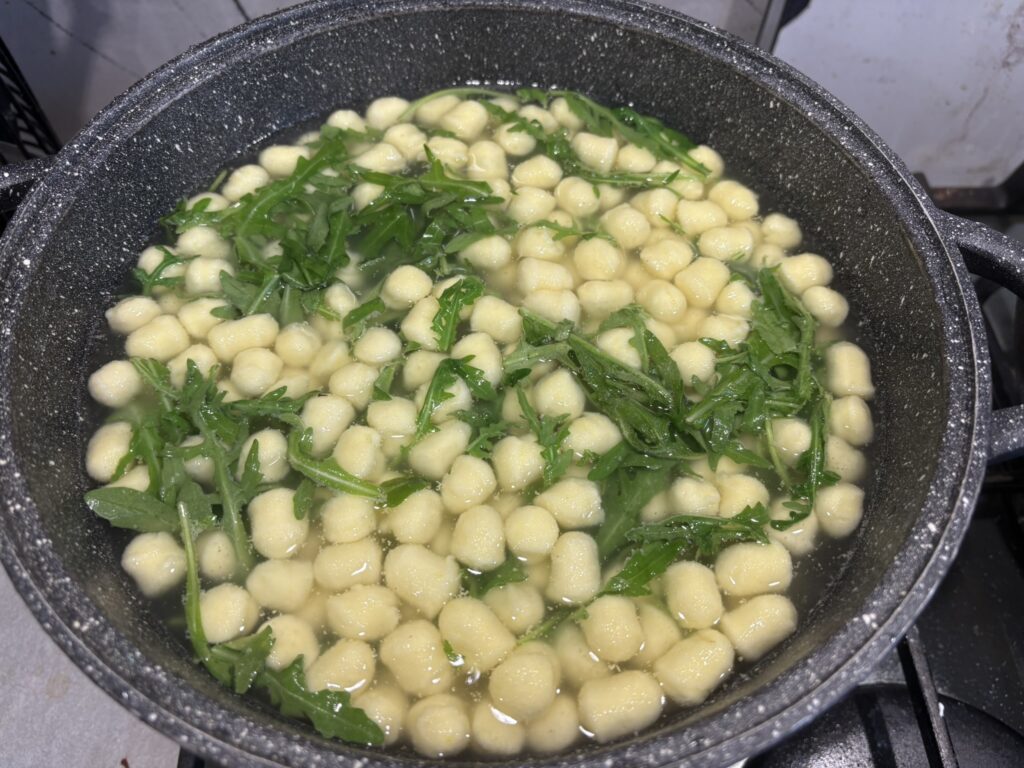 Mettete sul fuoco abbondante acqua leggermente salata e quando bolle aggiungete gli gnocchetti e la rucola pulita e portate a cottura