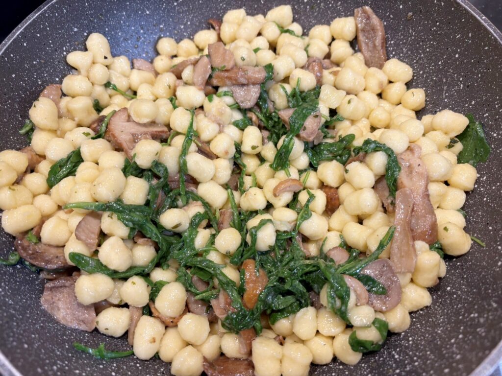 Scolate infine la pasta e la rucola , mettetela nella padella con i funghi e mescolate bene.