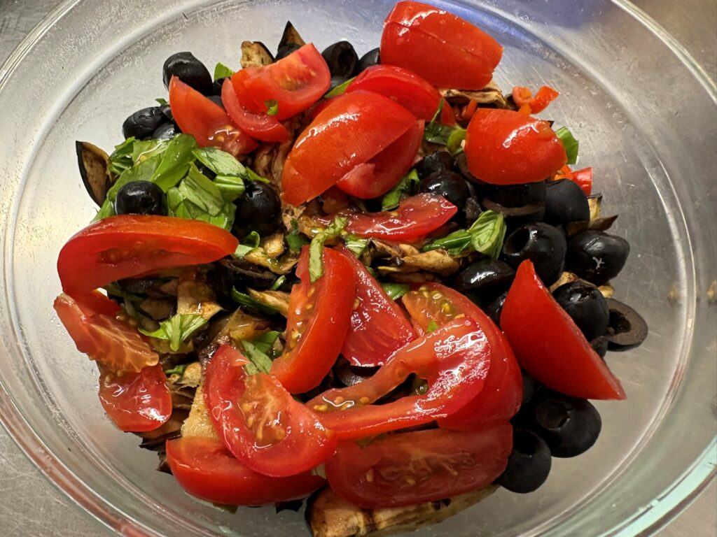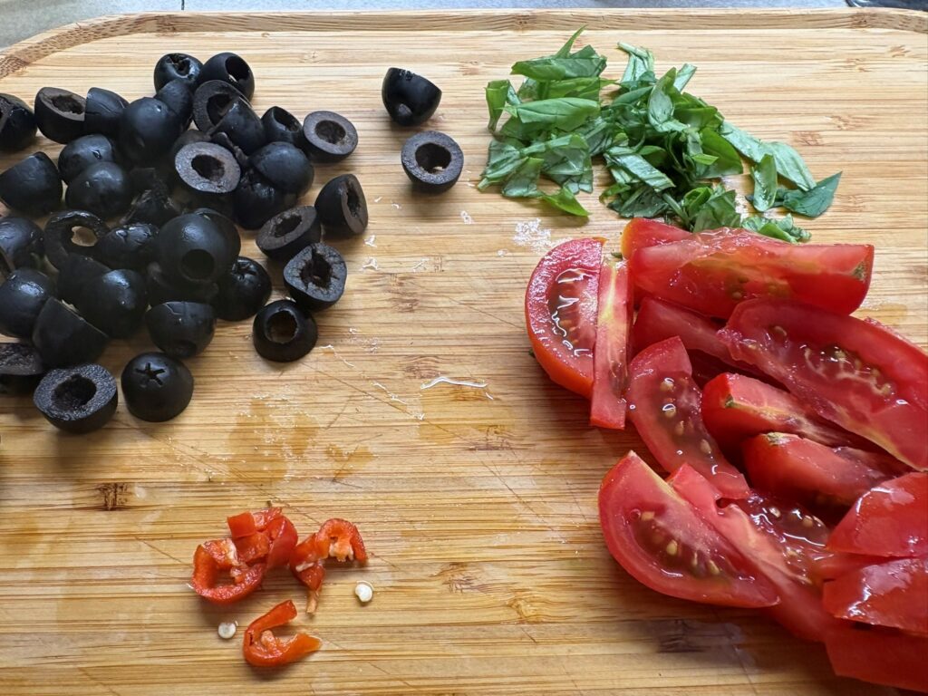 Tagliate a metà le olive, a pezzetti il basilico e il peperoncino e a spicchi i pomodorini.