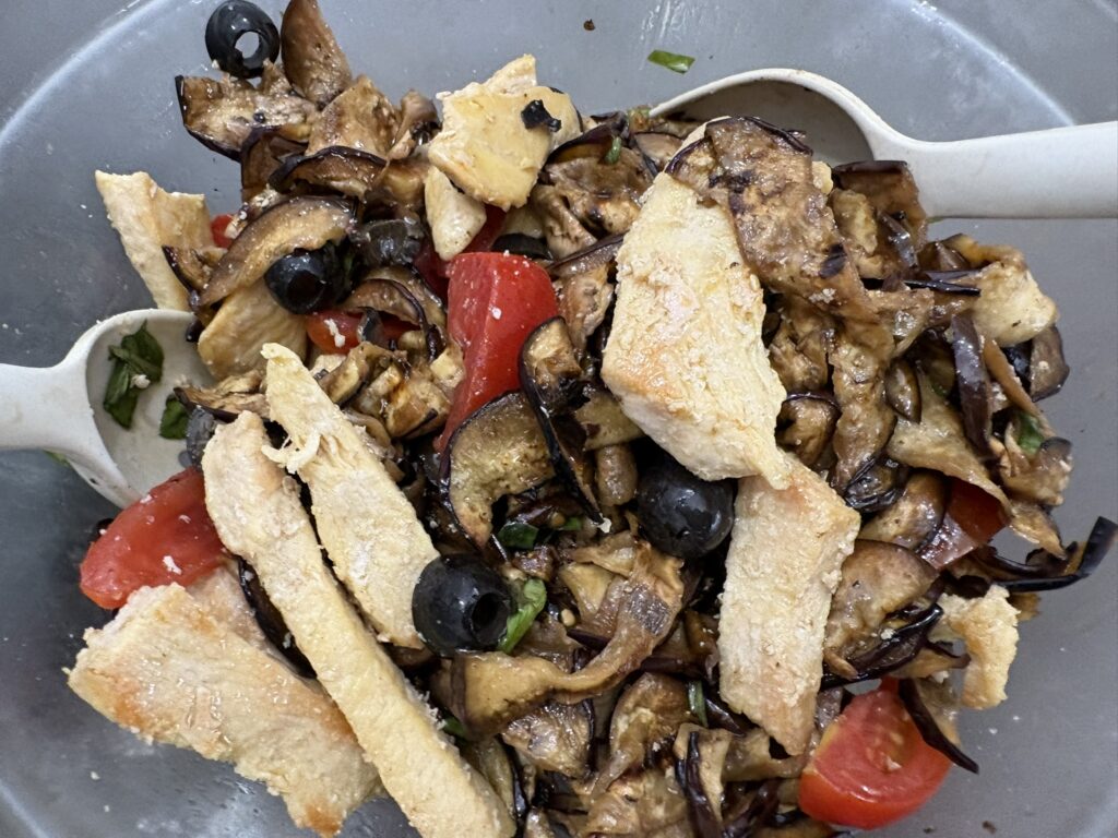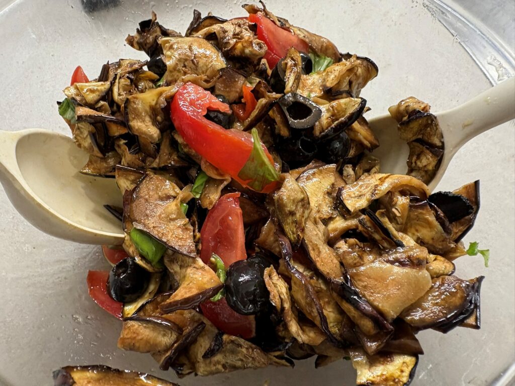 Mettete in una ciotola le melanzane tagliate a striscioline e aggiungete tutti gli altri ingredienti.
