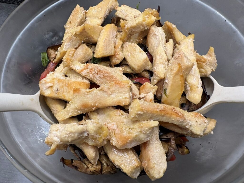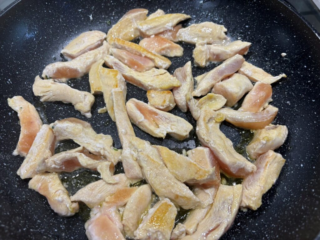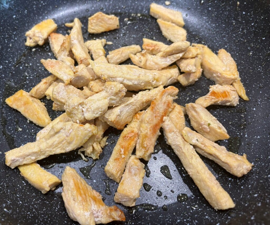Tagliate a listarelle il petto di pollo e cuocetelo bene in una padella con un giro di olio.