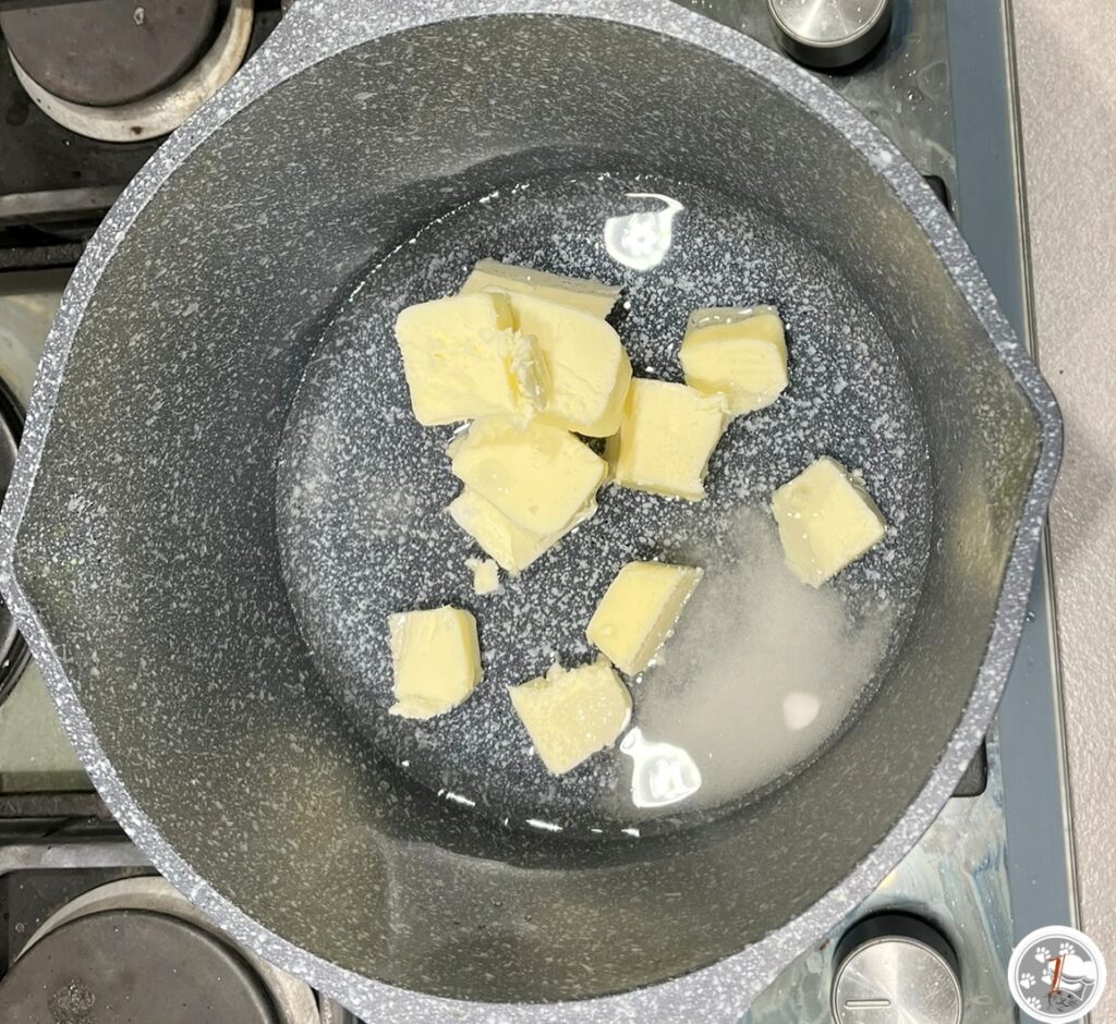 Mettete l’acqua e un pizzico di sale in un tegame , unite lo zucchero , il burro e portate ad ebollizione.