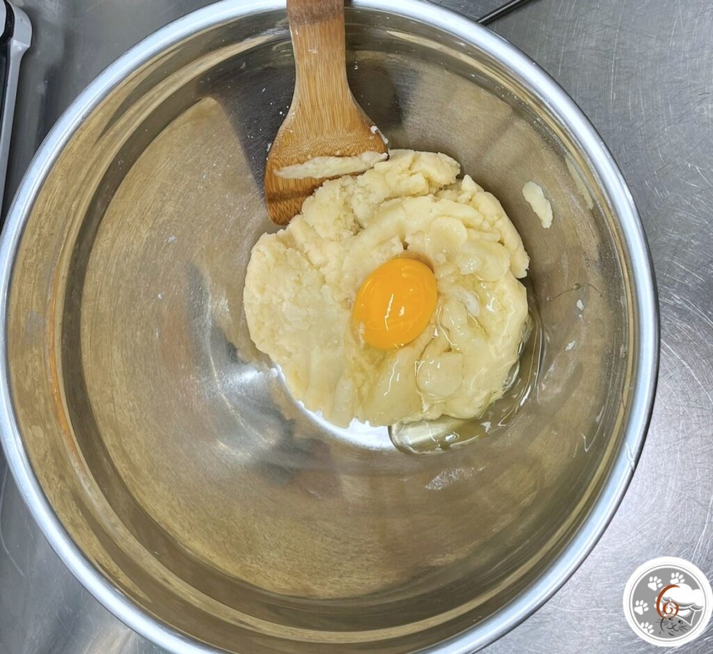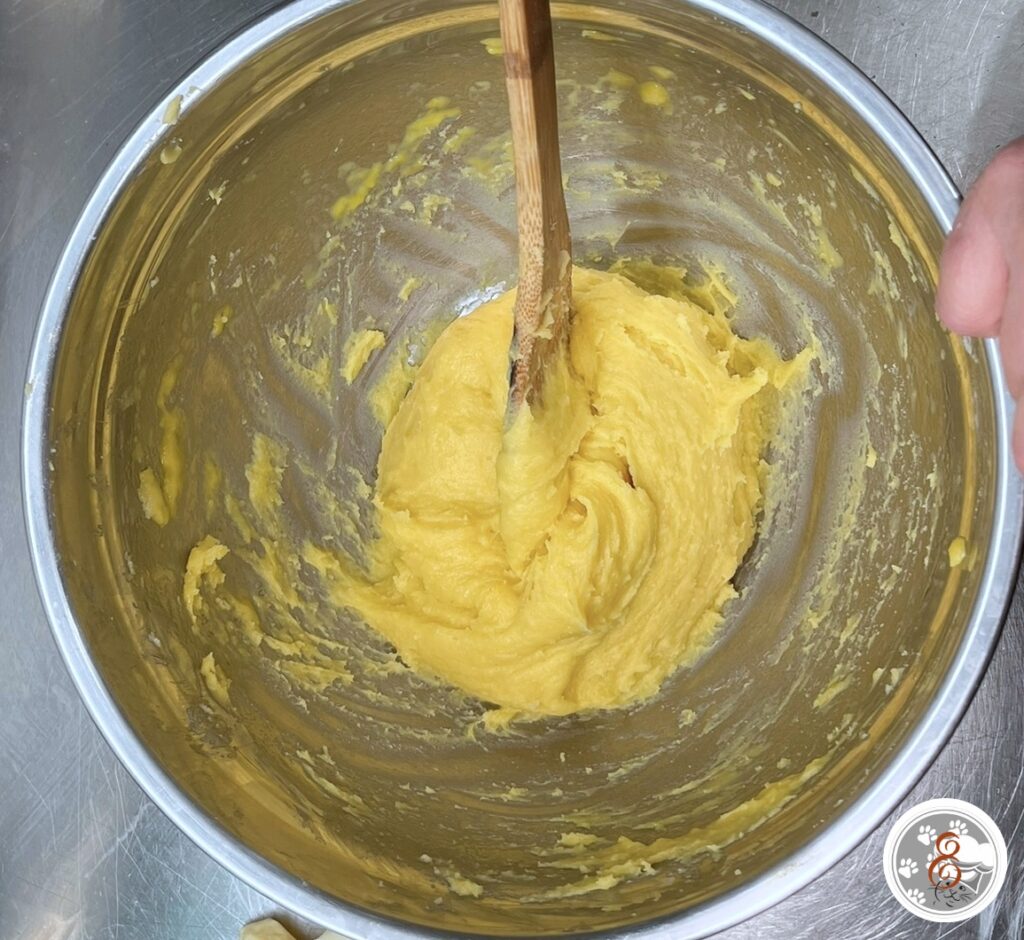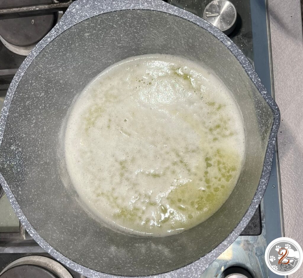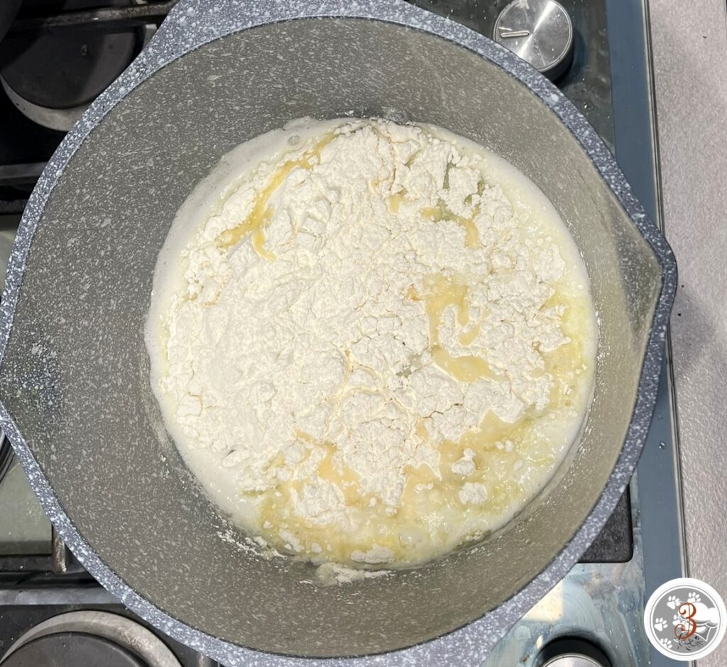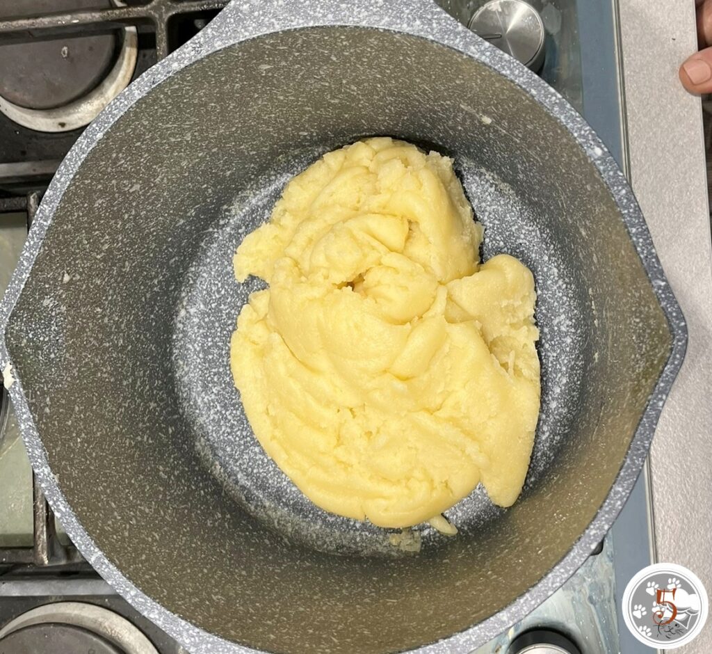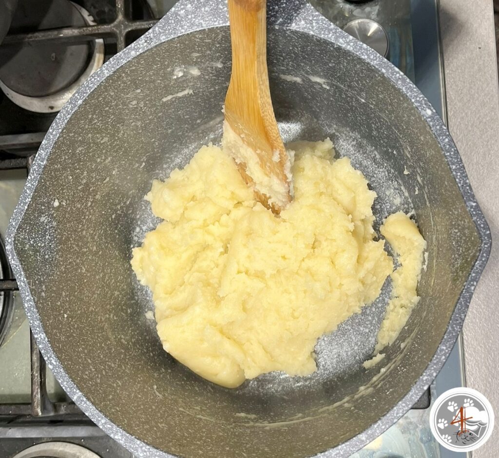 Quando la farina sara’ ben inglobata rimettete sul fuoco e lasciate cuocere per 2-3 minuti, finche il composto non si stacchera’ bene dalle pareti.