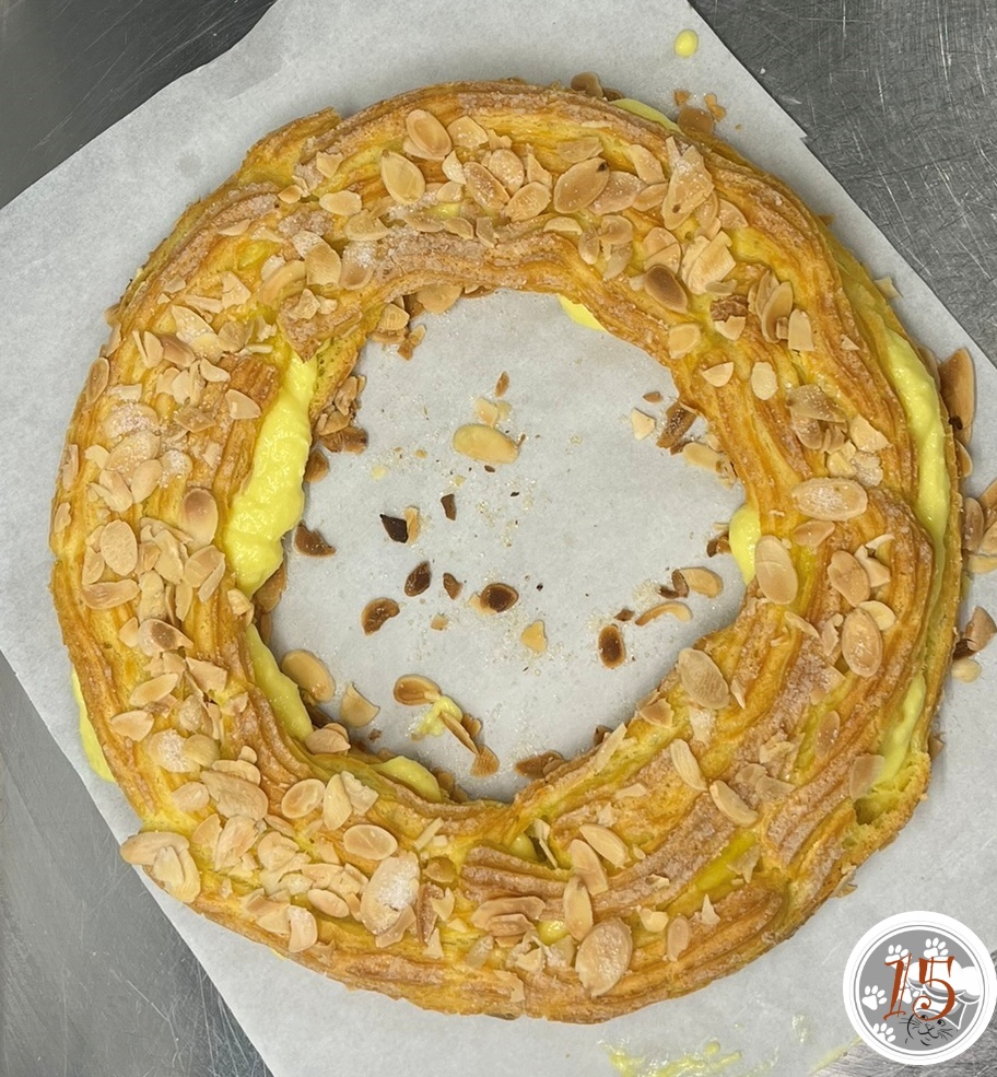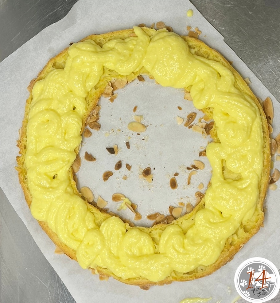 Lavorate con una frusta la crema pasticcera con il burro morbido e farciteci la Paris-Brest divisa a meta’.