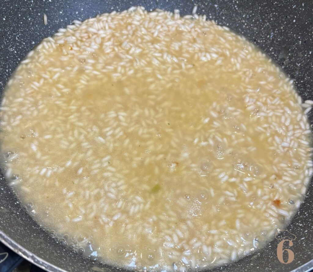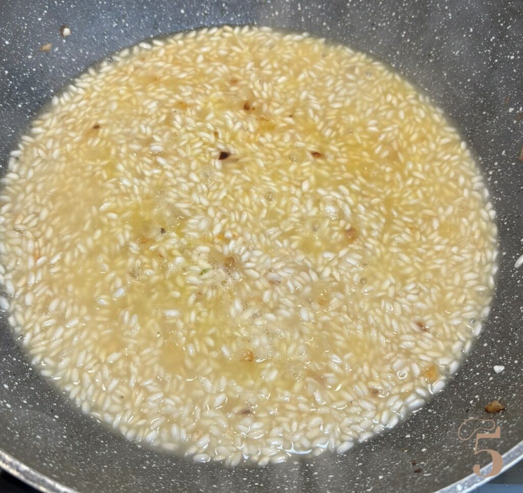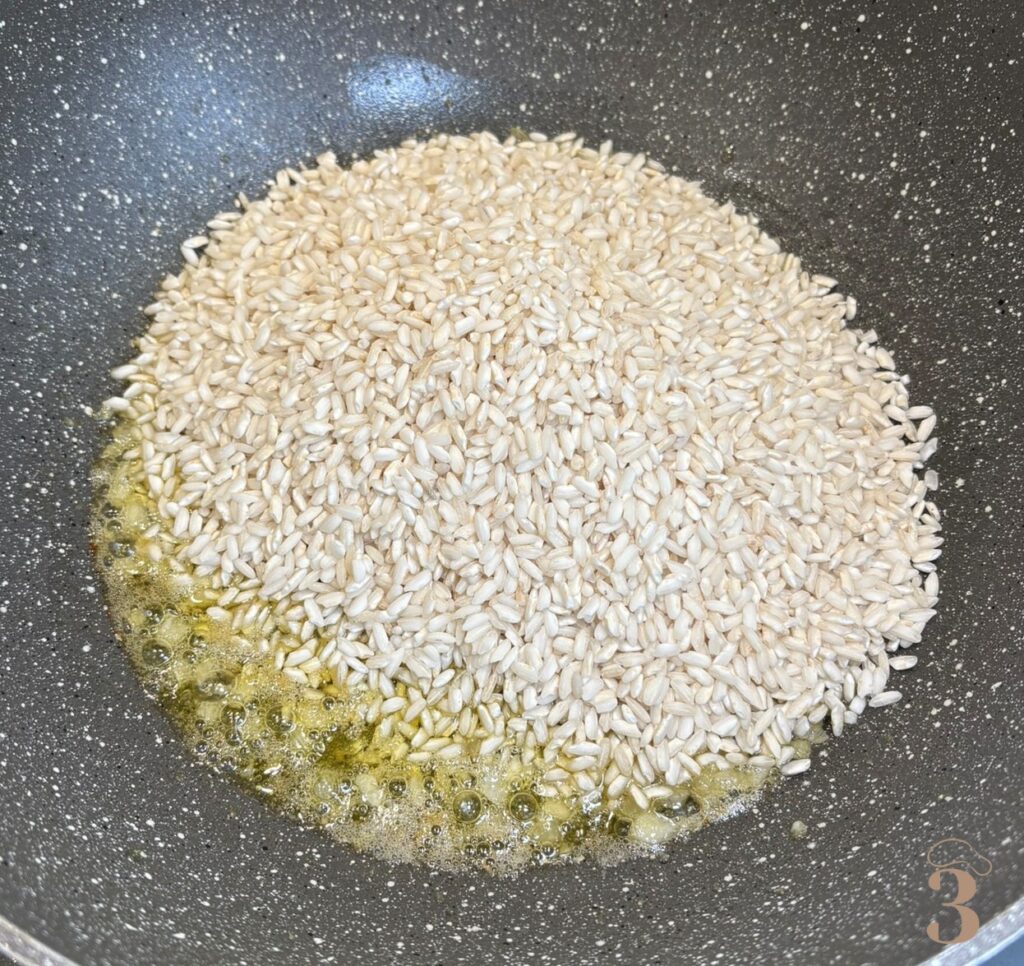 Aggiungete il riso e fatelo tostare a fuoco vivo per 2-3 minuti.