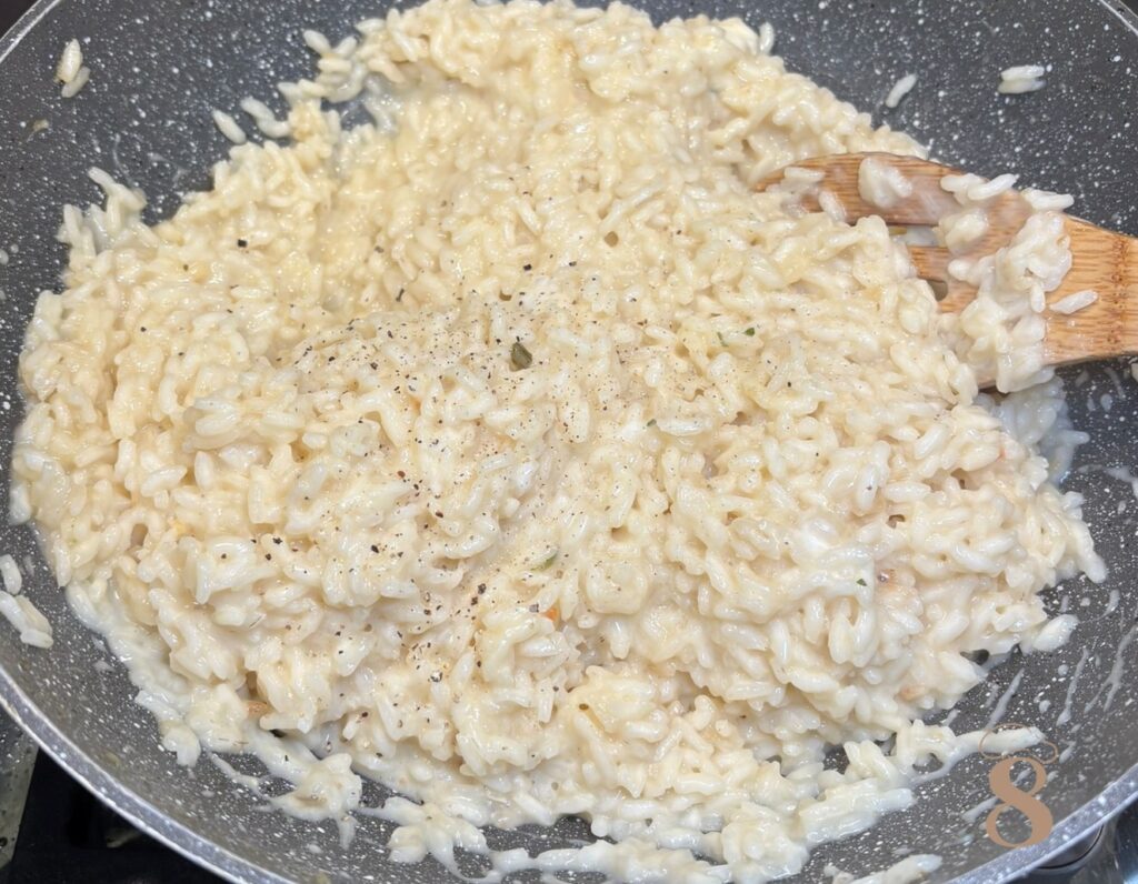 Un risotto saporito, con ingredienti che insieme creano un piatto ricco e sostanzioso.