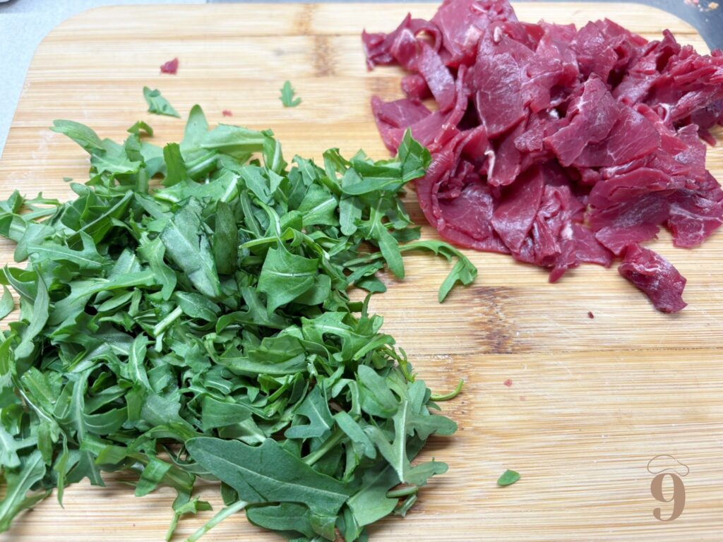 Tagliate a listarelle la bresaola e a pezzettini la rucola.