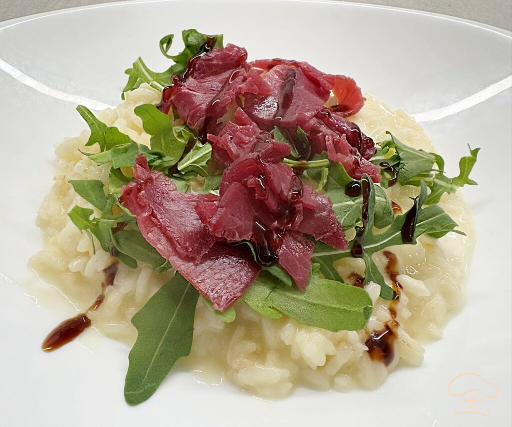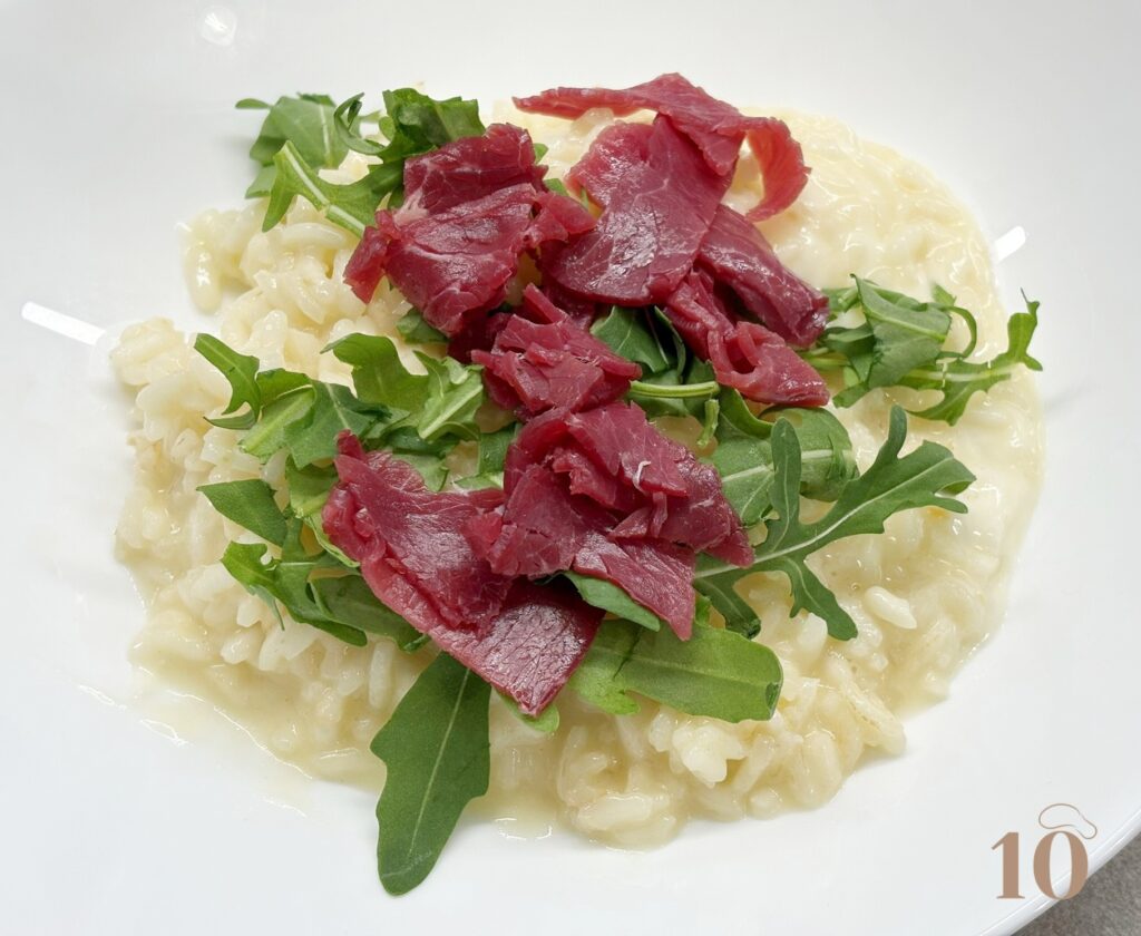 Impiattate il riso e su ogni porzione mettete un pochino di rucola e di bresaola.