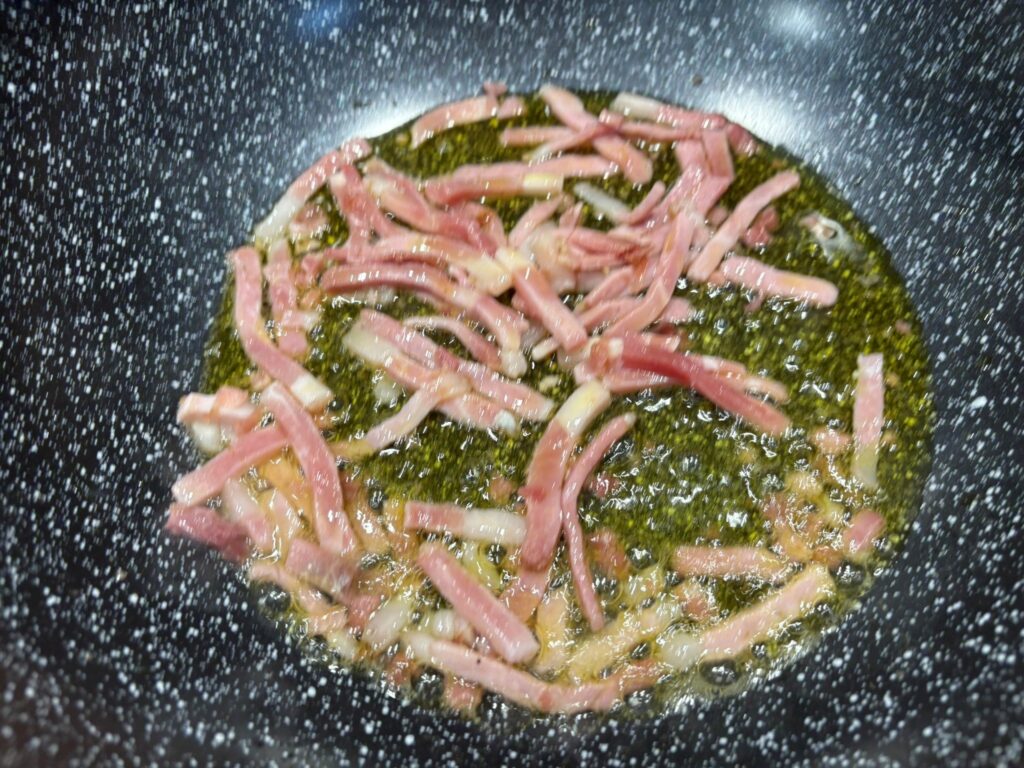 Soffriggete per un paio di minuti lo speck a listarelle in padella con 3 cucchiai di olio .