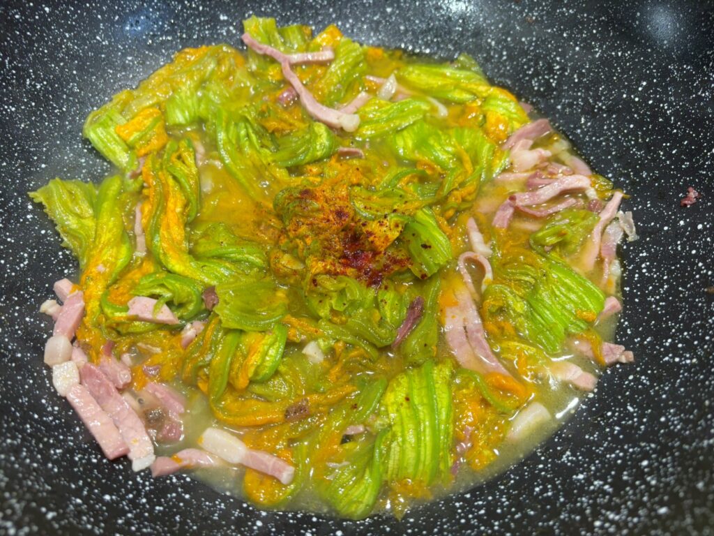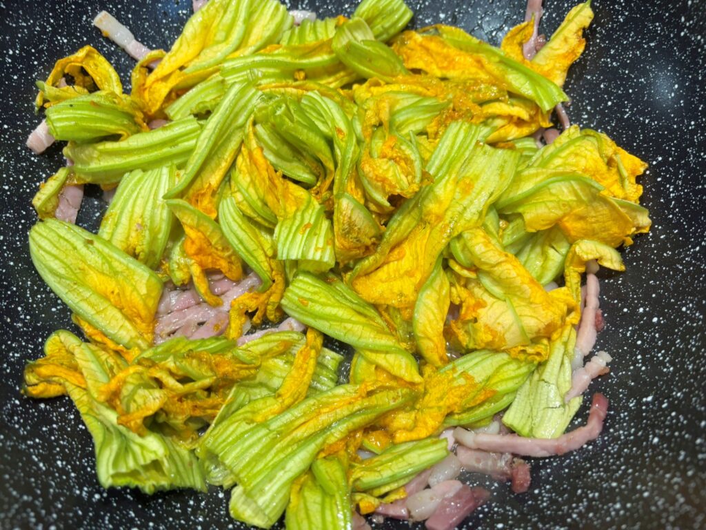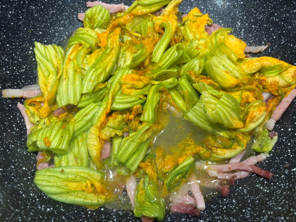 Togliete i pistilli ai fiori di zucca, lavateli , asciugateli e metteteli in padella.