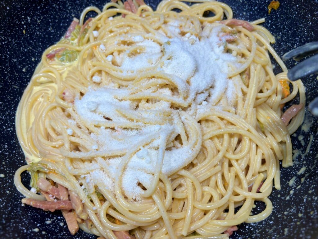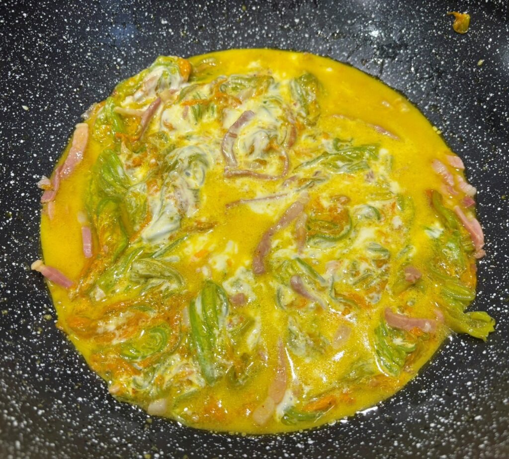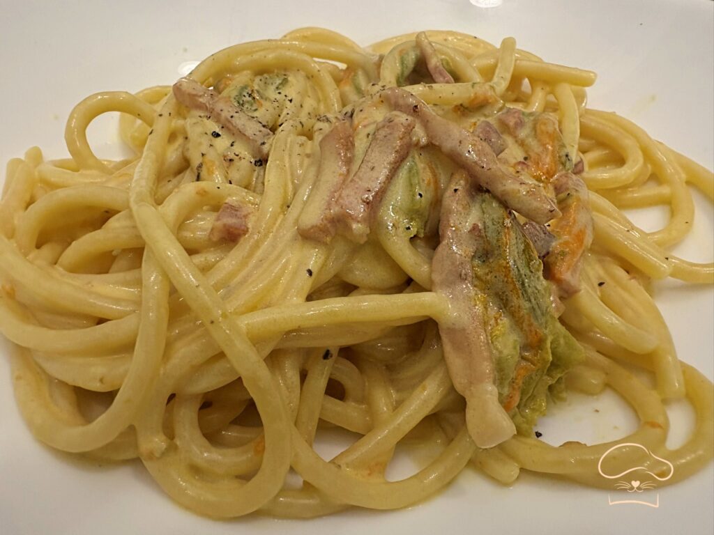 Spaghettoni cremosi fiori di zucca, speck e zafferano