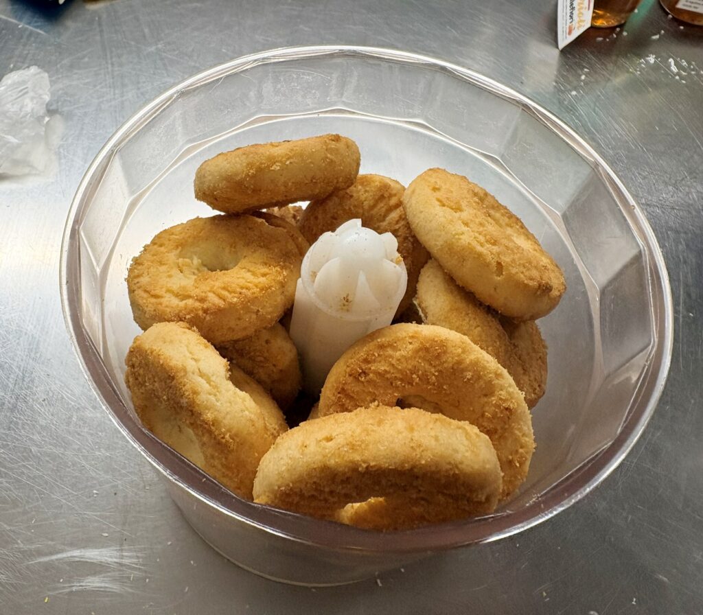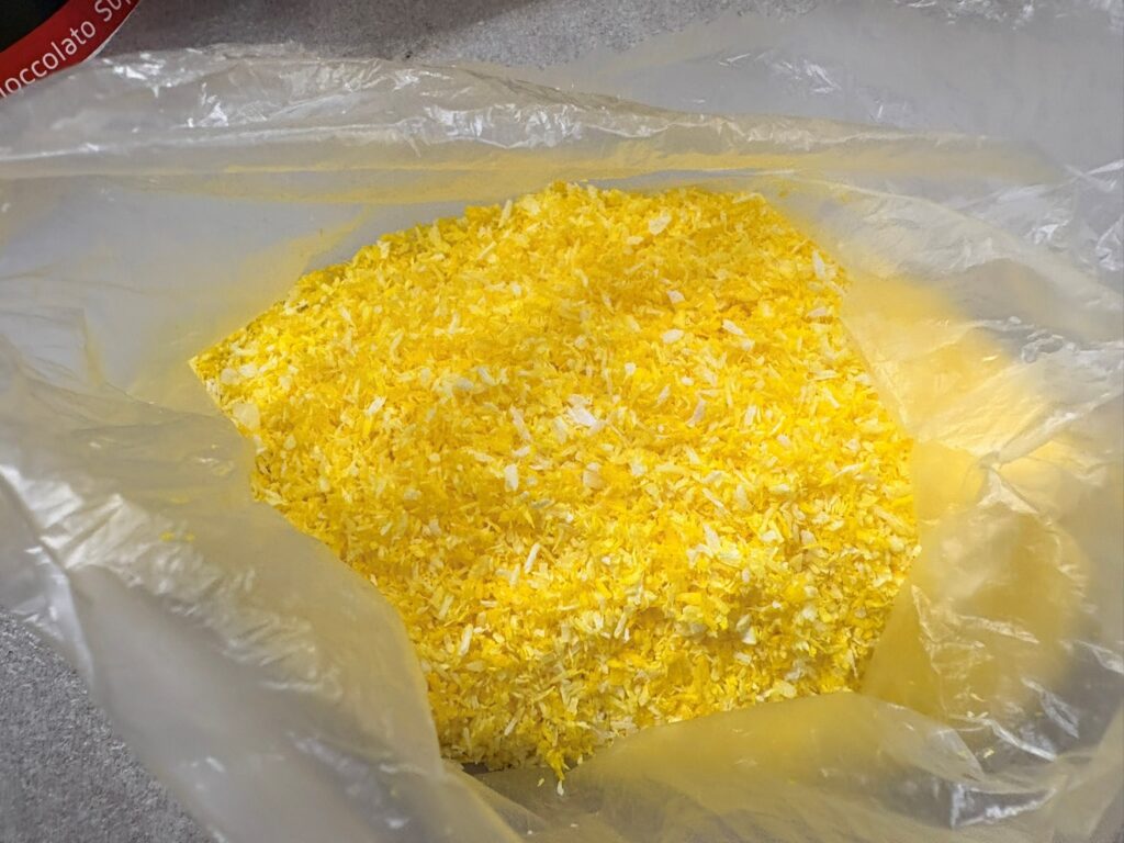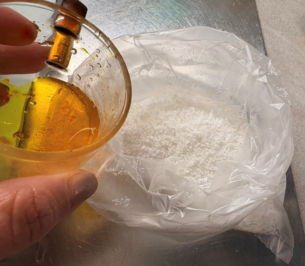 In un sacchetto di plastica mettete mezzo bicchiere di farina di cocco e aggiungete qualche goccia di colore giallo sciolto dentro 3-4 cucchiai di acqua.