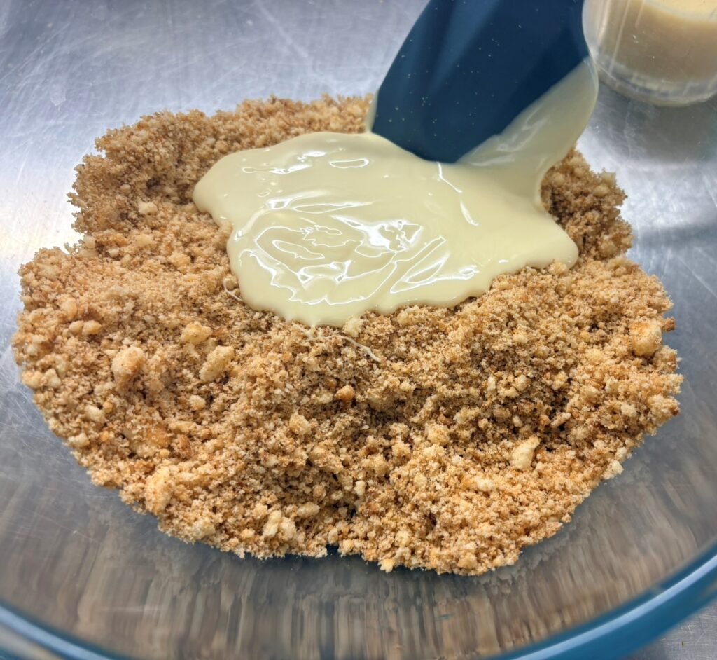 Sciogliete a bagnomaria o al microonde il cioccolato bianco e versatelo sui biscotti.