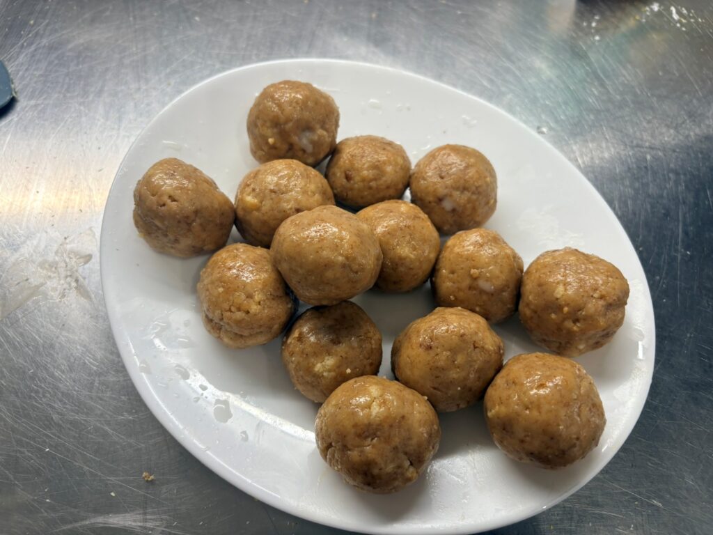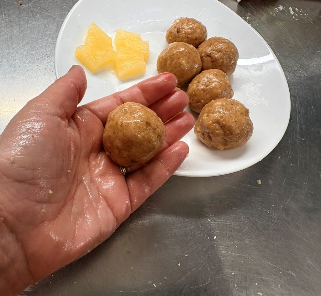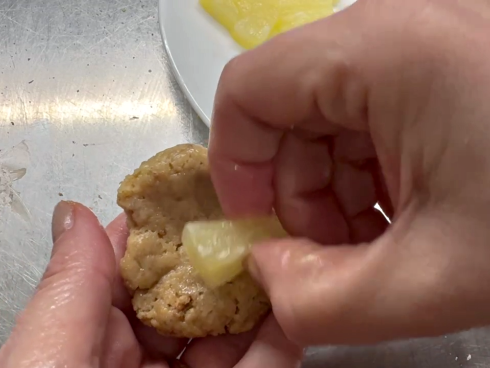 Prelevate palline di composto , schiacciatele leggermente e mettete al centro un pezzetto di ananas.
