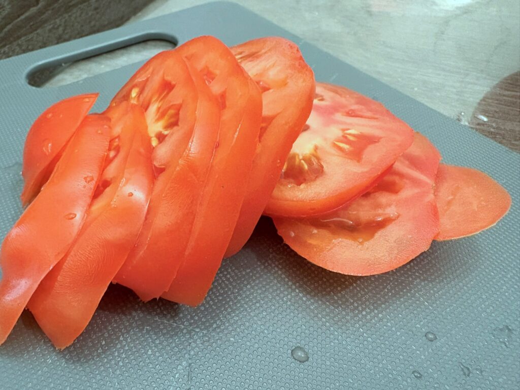 Tagliate a fettine i pomodori e la cipolla.