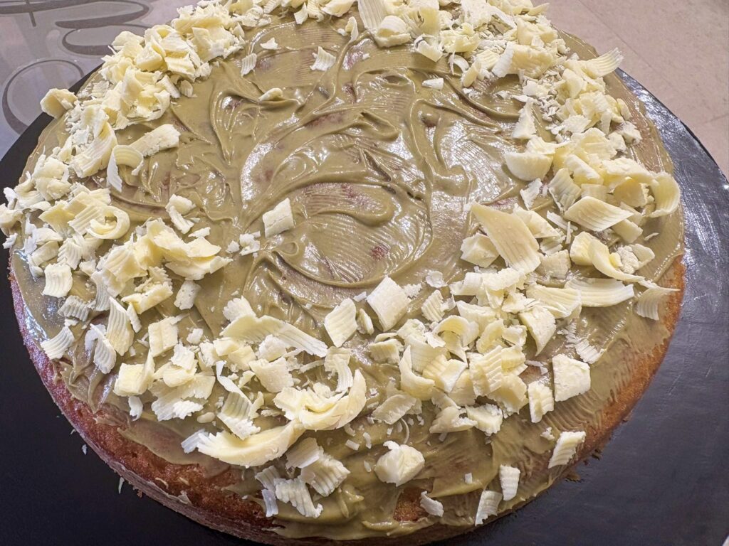 Spalmate sulla superficie la crema di pistacchi e decorate con riccioli di cioccolato bianco.