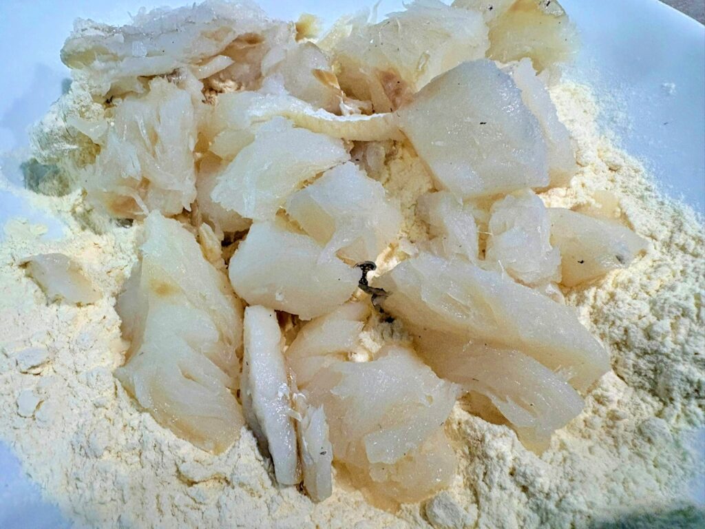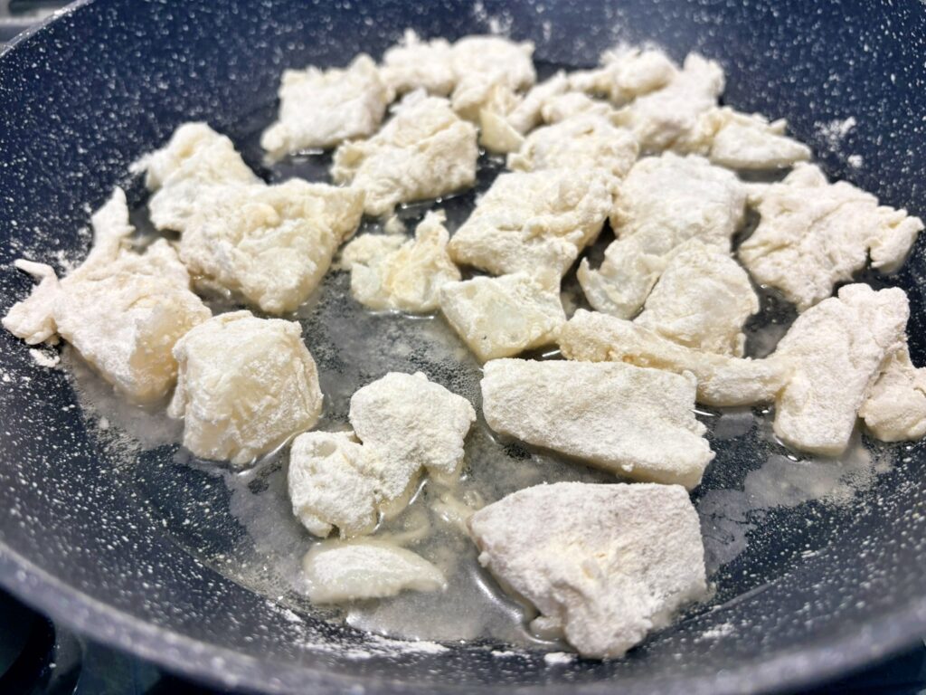 Tagliate a pezzi il baccalà già spinato e ammollato e doratelo leggermente in un giro di olio caldo.
