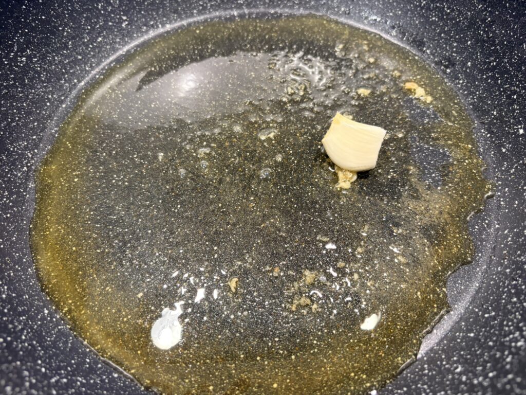 Nella stessa padella aggiungete dell’olio e rosolate uno spicchio di aglio.