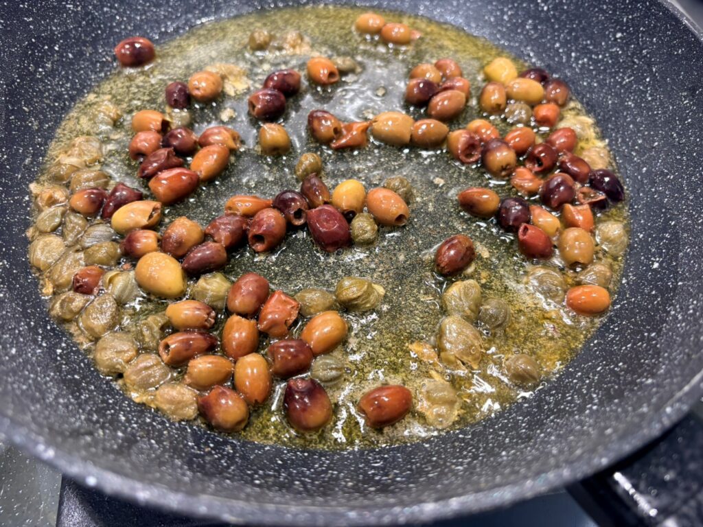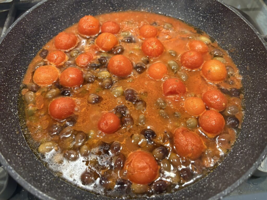 Unite le olive taggiasche e i capperi , mescolate e dopo un minuto mettete in padella i pomodorini.