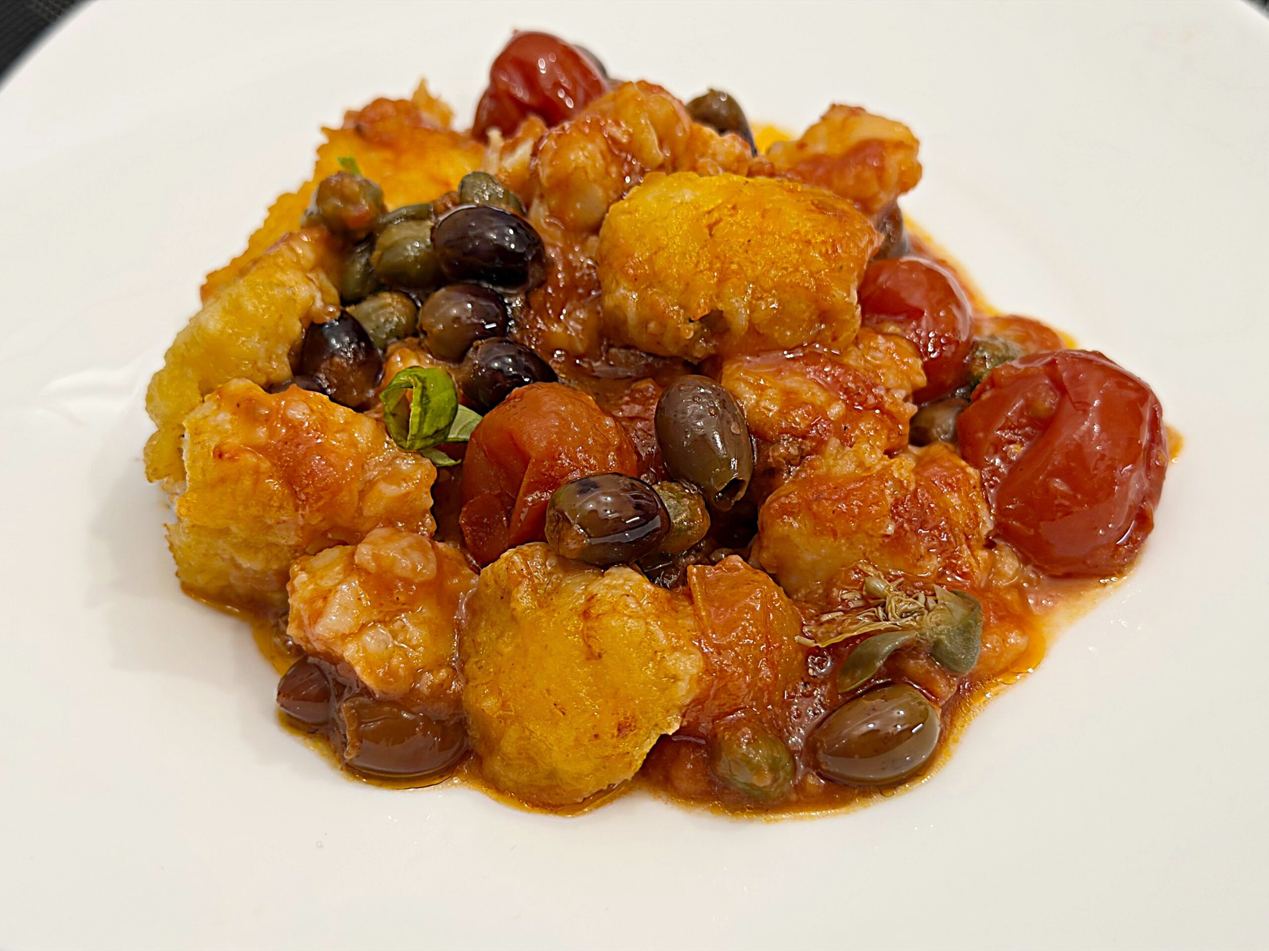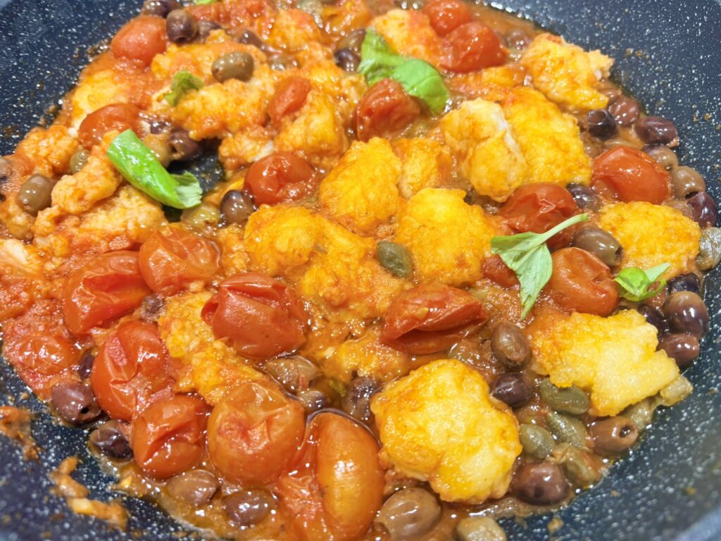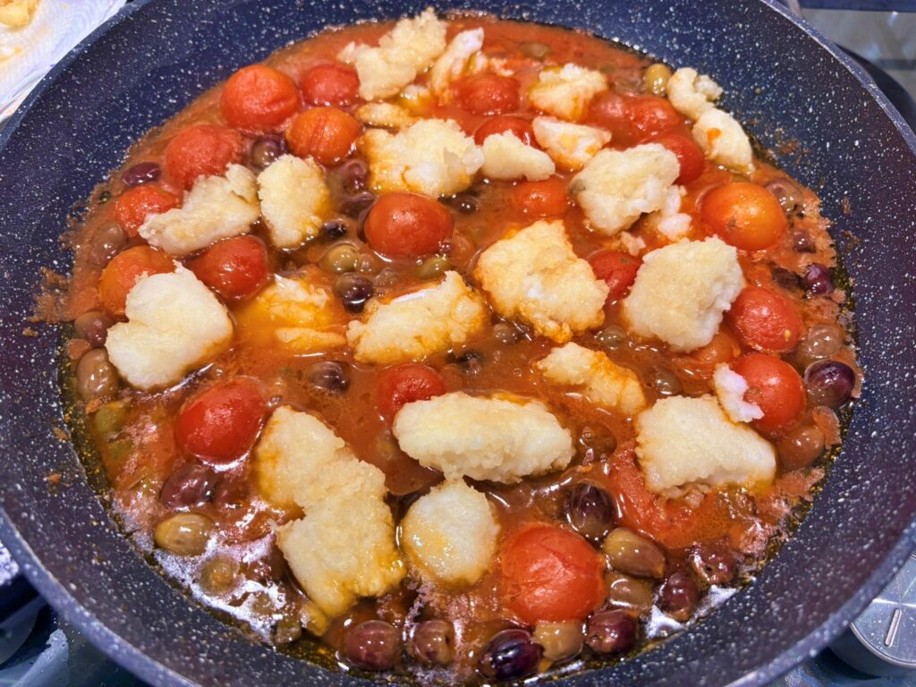 Aggiungete anche il baccalà cotto e prolungate la cottura per altri 6-7 minuti, fino a cottura del pesce che deve rimanere sodo.