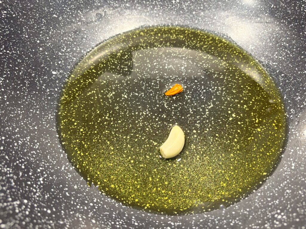 In un capiente tegame con l’olio mettete l’aglio e il peperoncino.