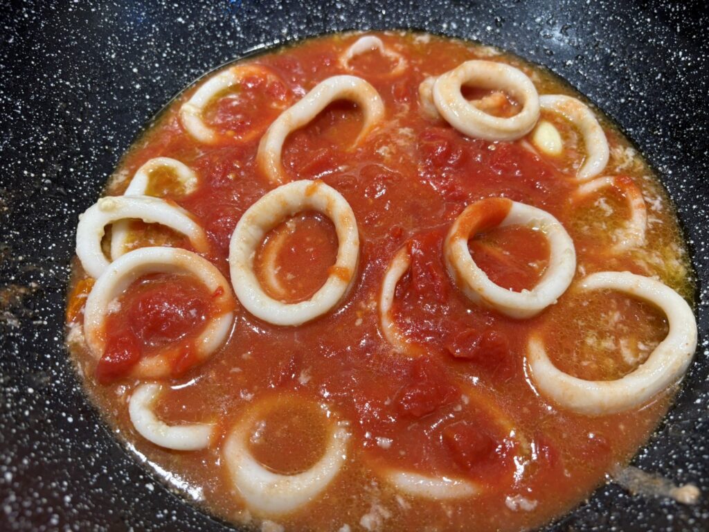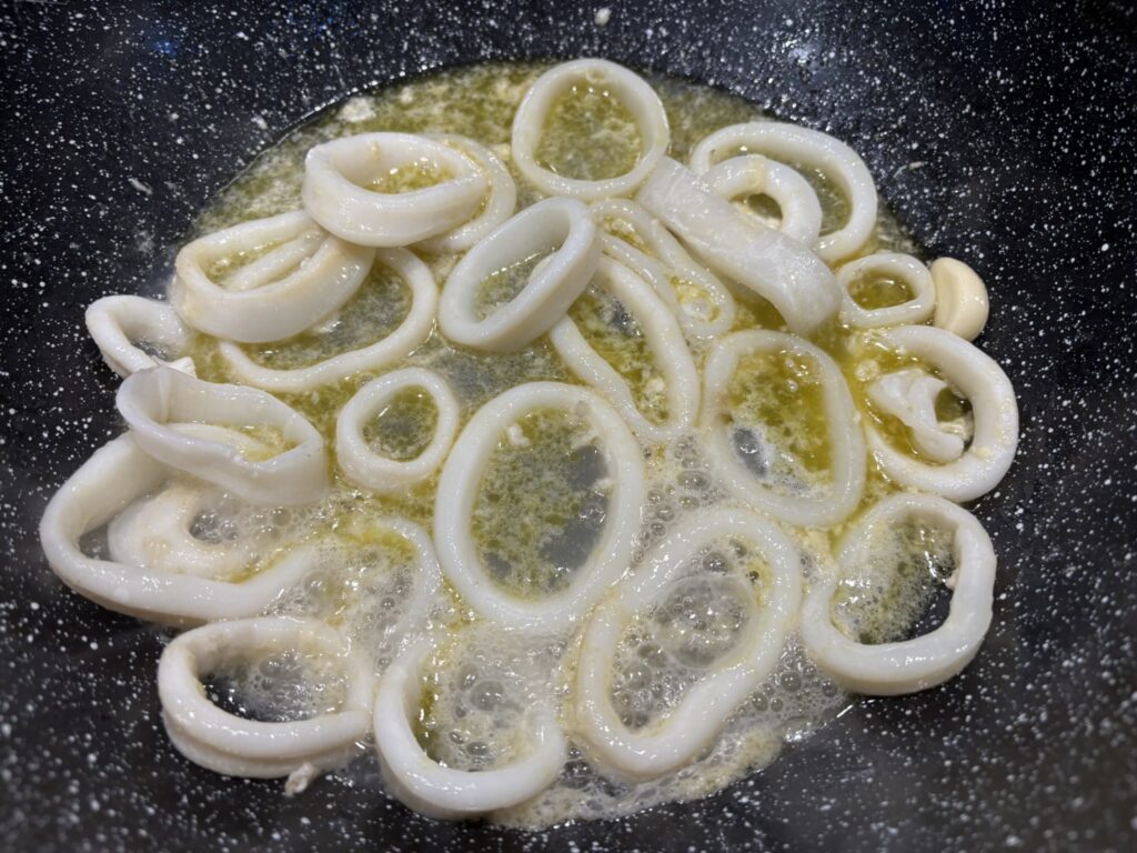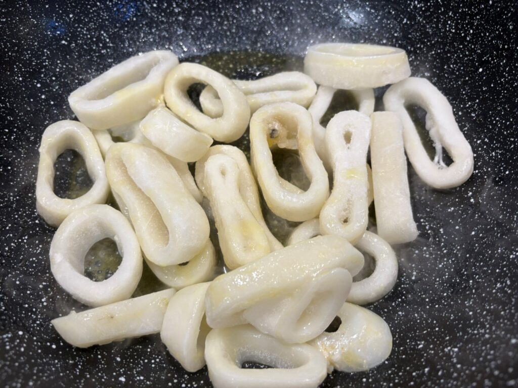 Fate rosolare e aggiungete gli anelli di calamaro.