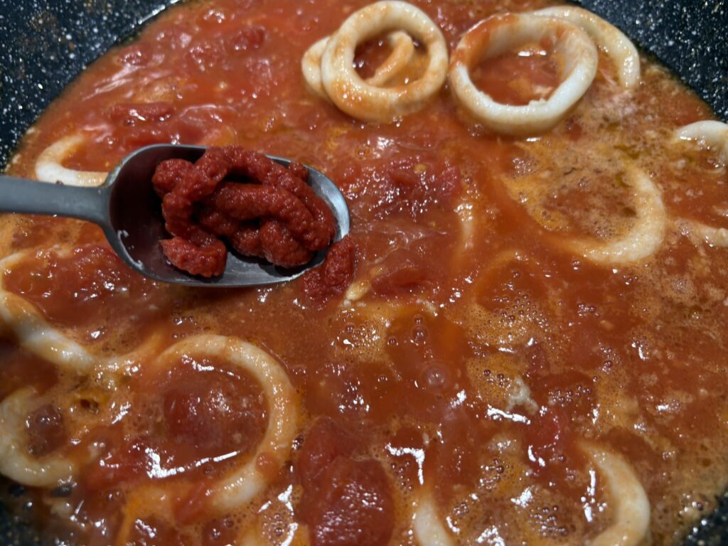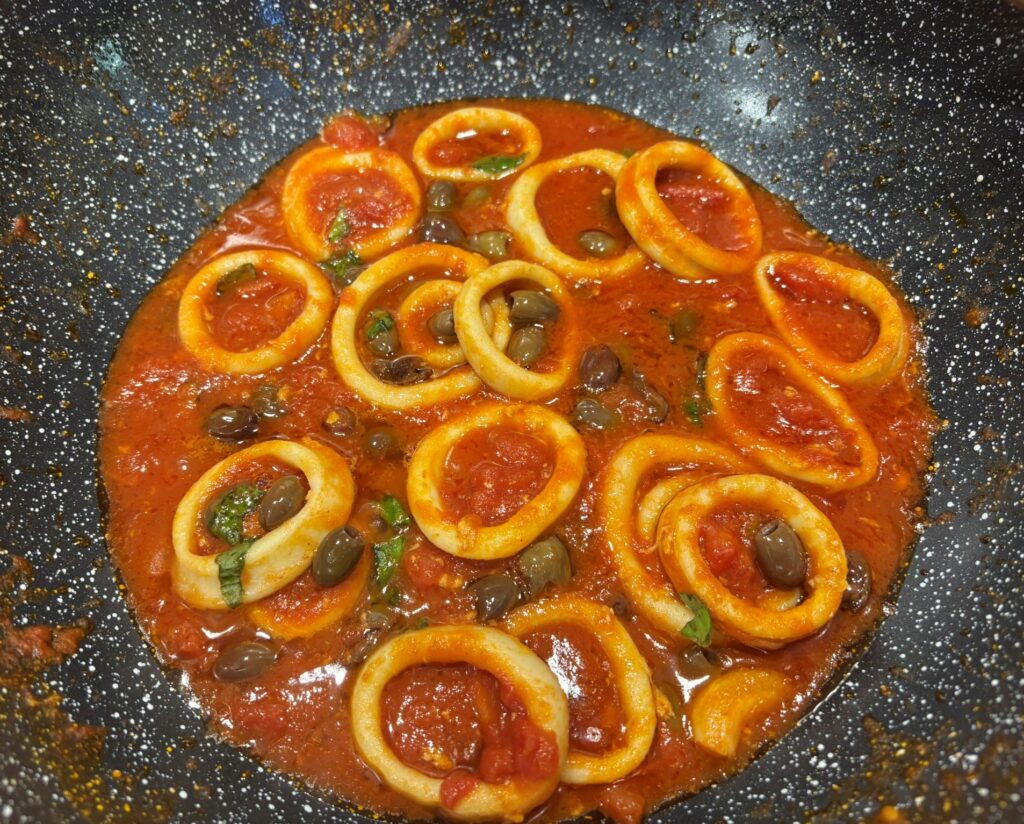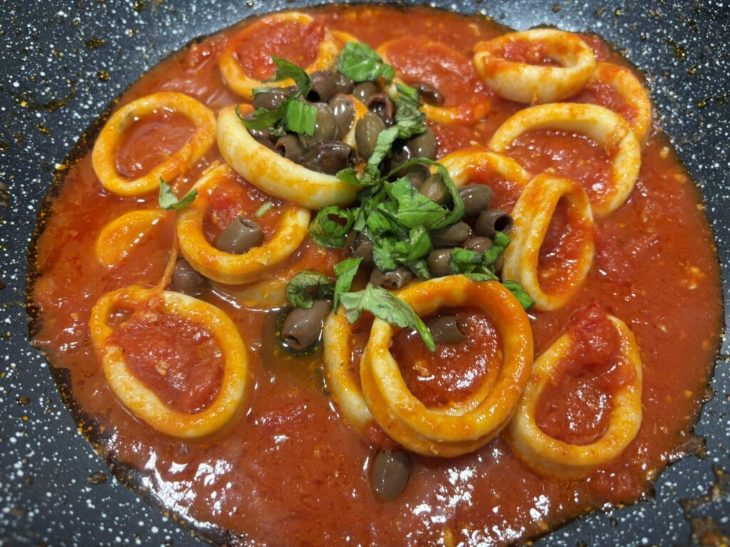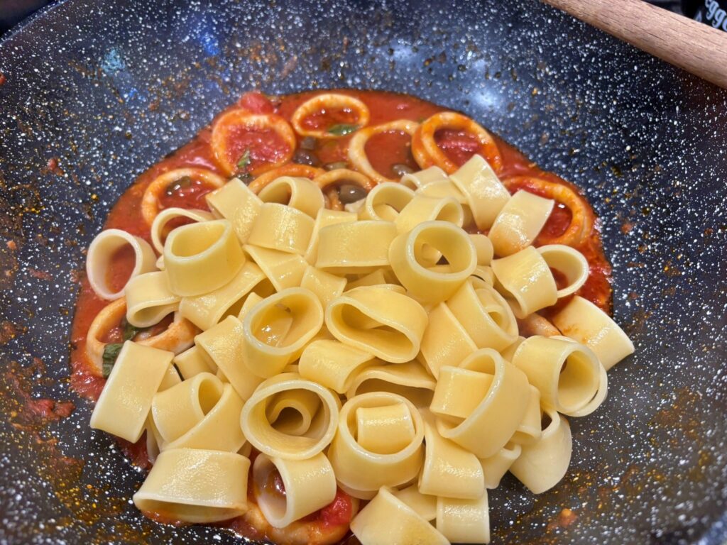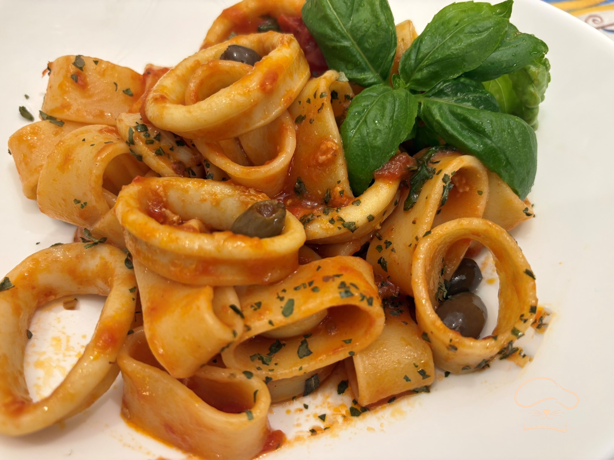 Calamarata al sugo di anelli di calamaro e olive taggiasche