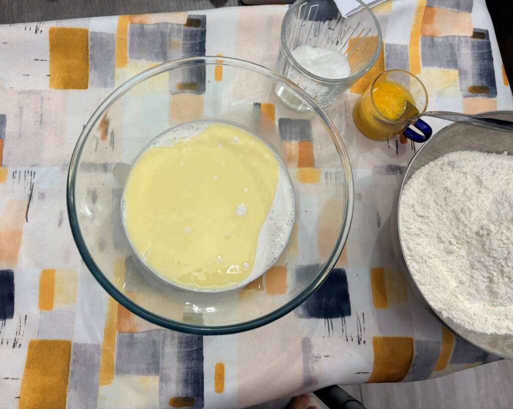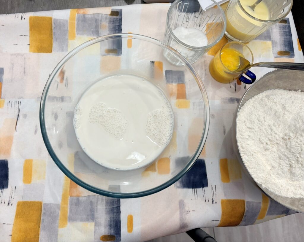 Intiepidite leggermente il latte e in 50 gr tolti dal totale sciogliete il lievito di birra.