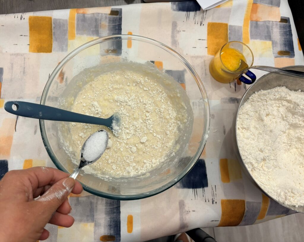 Aggiungete qualche manciata di farina, il sale e cominciate a mescolare .