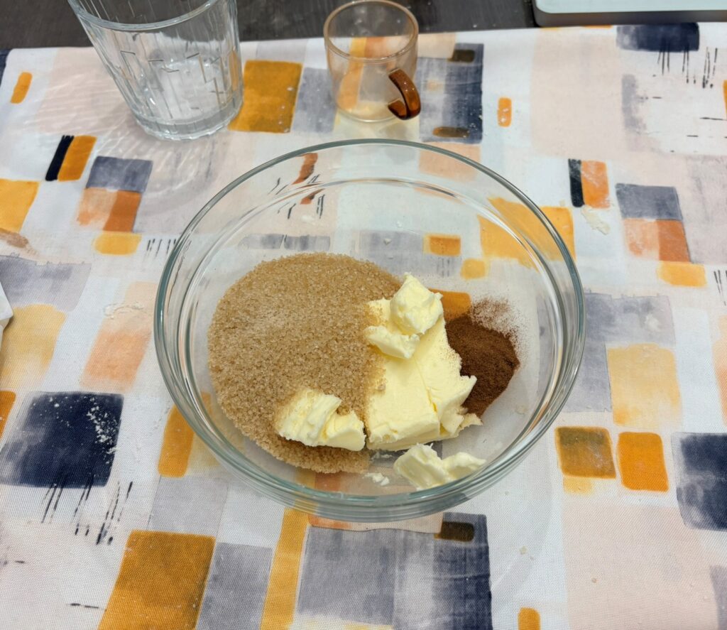 In una ciotolina lavorate il burro morbido con la cannella e lo zucchero e spalmate il preparato sull’impasto steso.