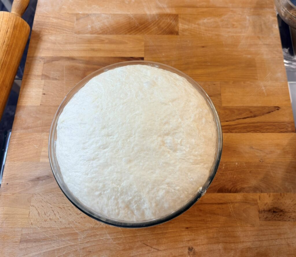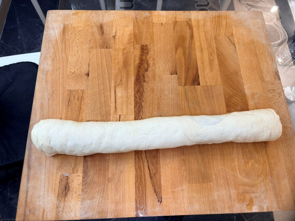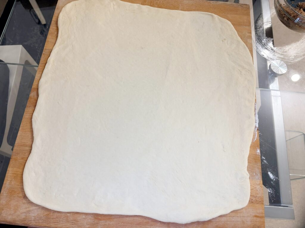 Riprendete l’impasto ben lievitato e stendetelo fino ad ottenere un rettangolo di circa 1 cm di spessore.