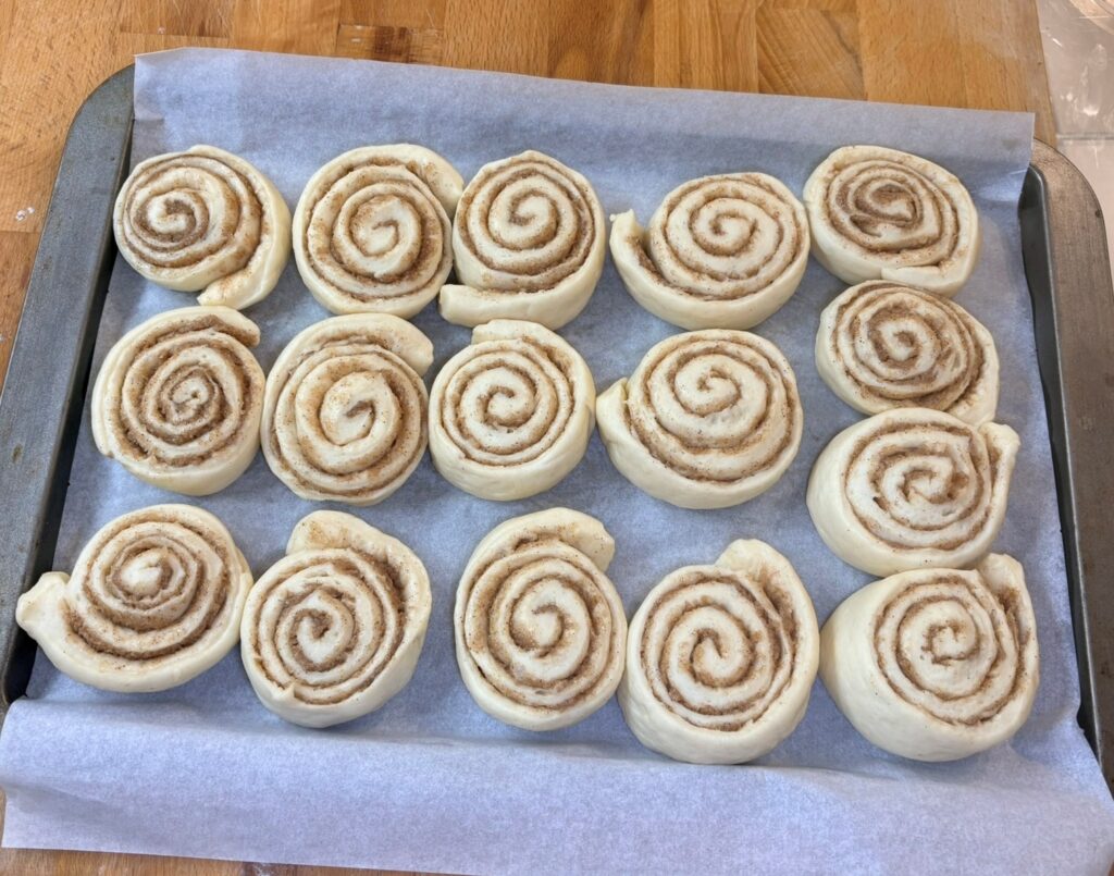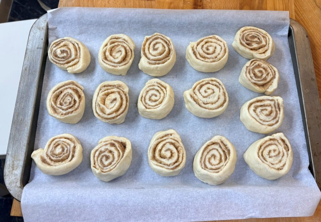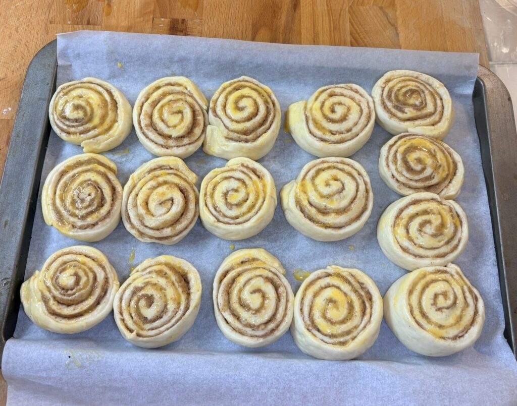 Sistemate le girelle di cannella ottenute in una teglia imburrata e infarinata, o coperta con carta forno. Lasciate lievitare i cinnamon rolls per altri 30 minuti, spalmateli delicatamente con l’altra meta’ dell’uovo sbattuto rimasto poi cuocete in forno statico preriscaldato a 180° per 30 minuti, fino a doratura.