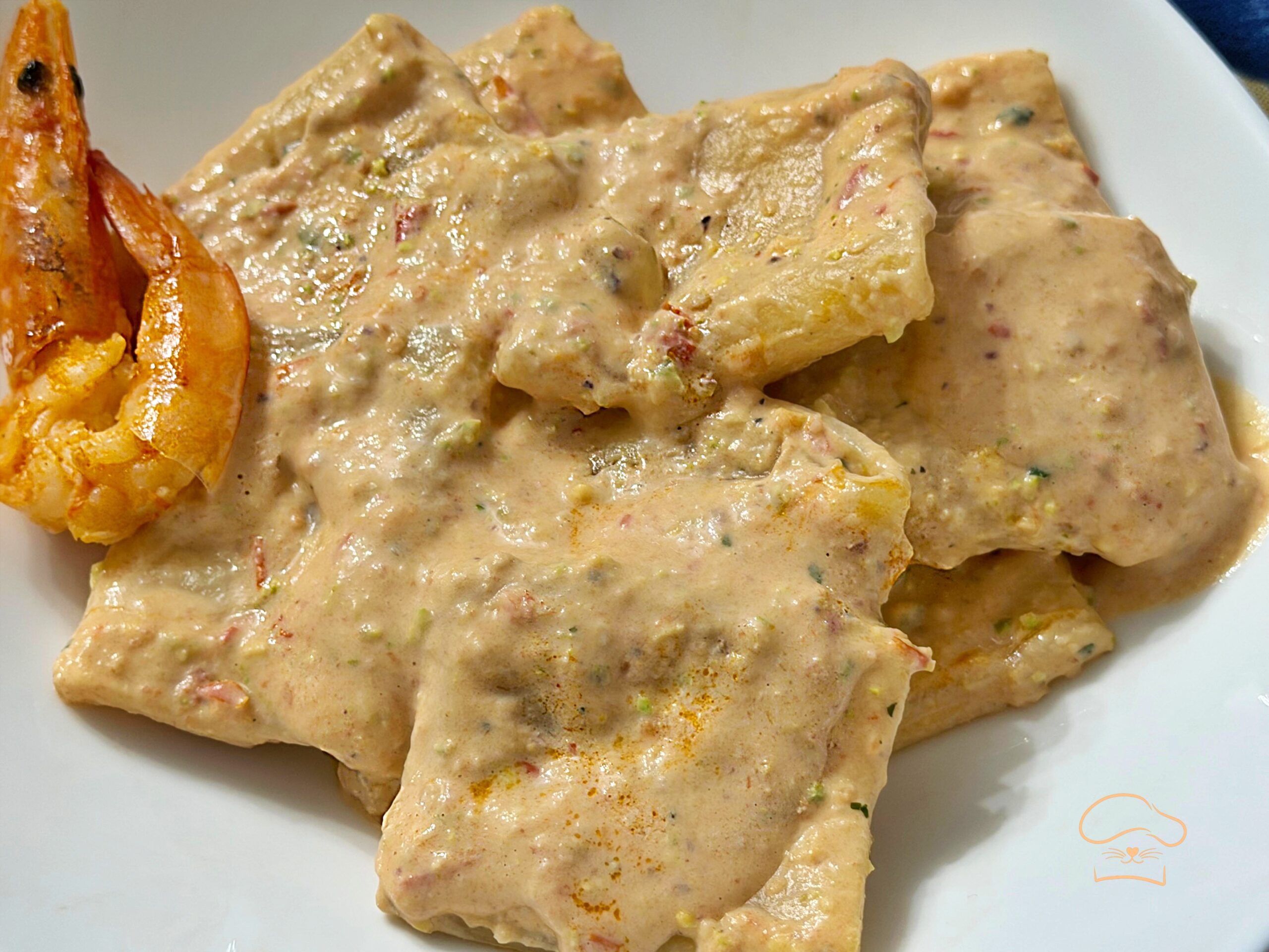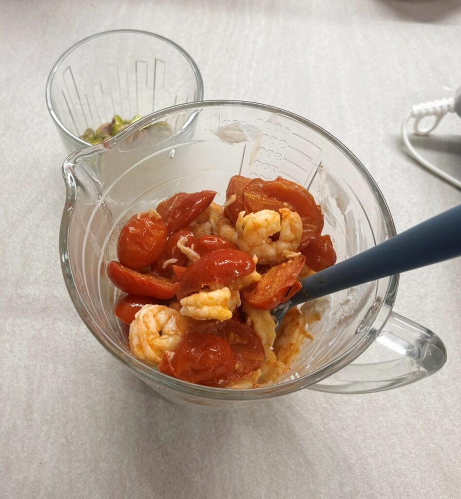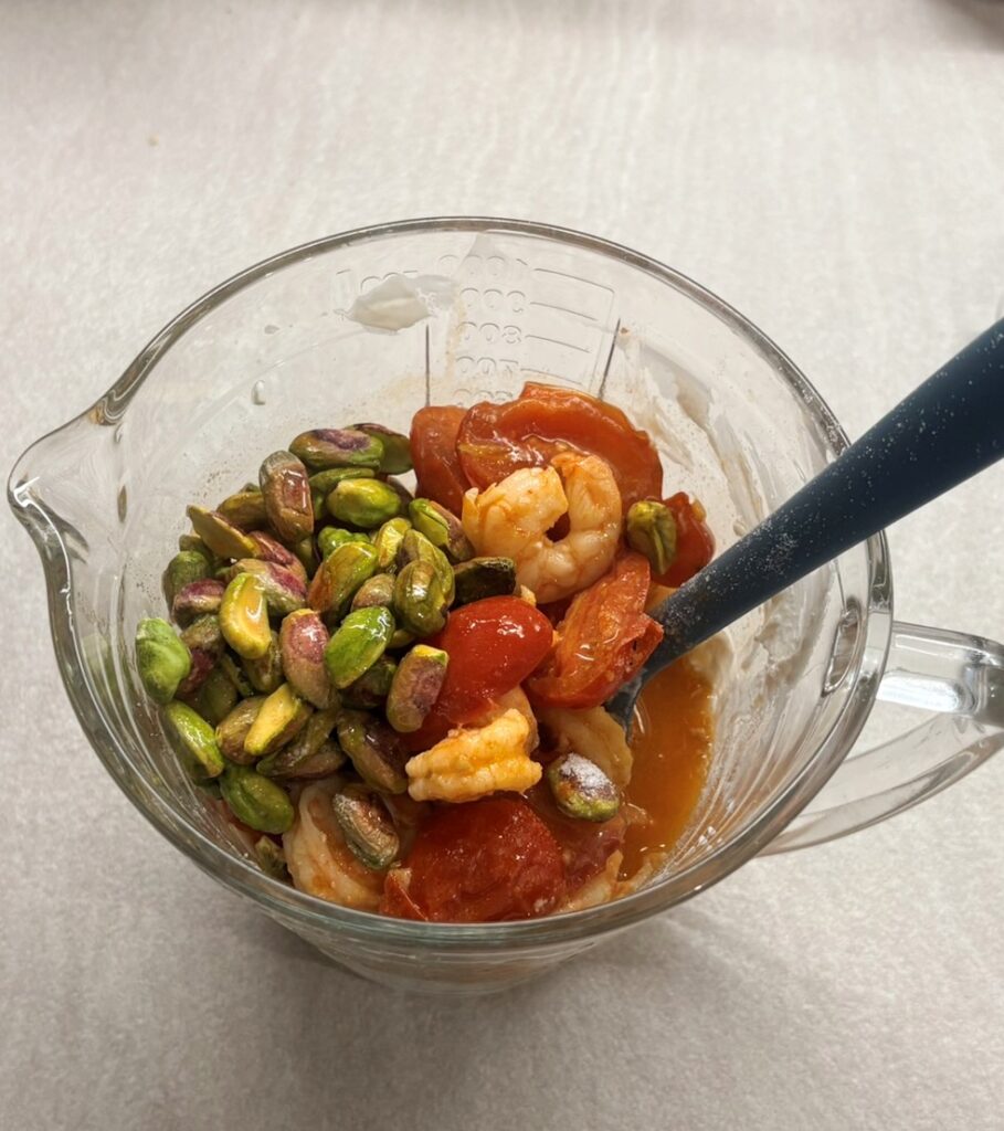 In una ciotola mettete la ricotta, i pomodori e le mazzancolle cotte, i pistacchi, il sughetto filtrato dei crostacei e aggiustate di sale.
