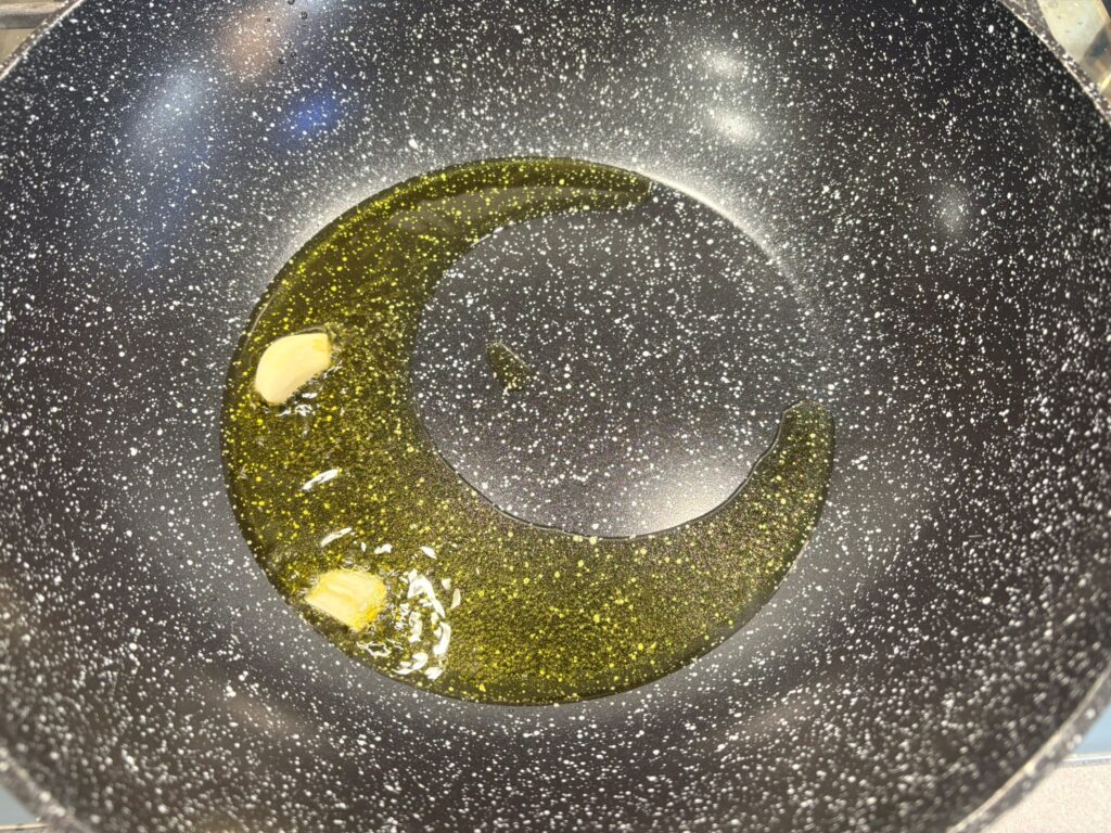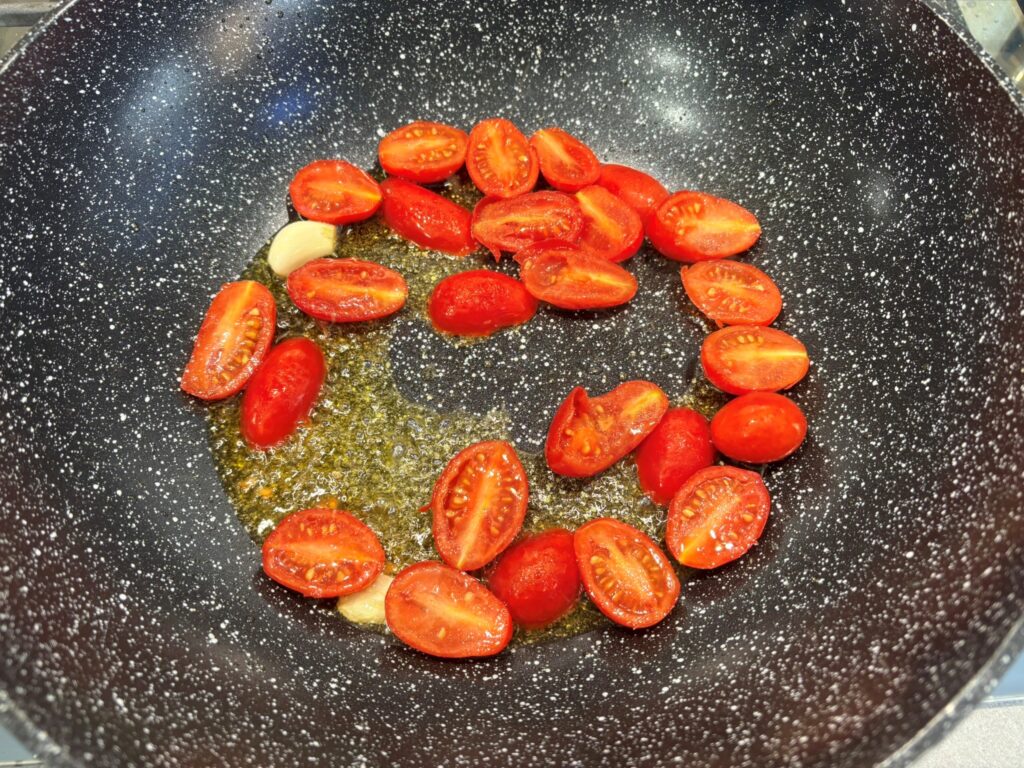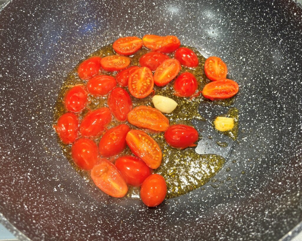 Rosolate l’aglio in 3-4 cucchiai di olio, unite i pomodorini tagliate a meta’ e cuocete 5 minuti.