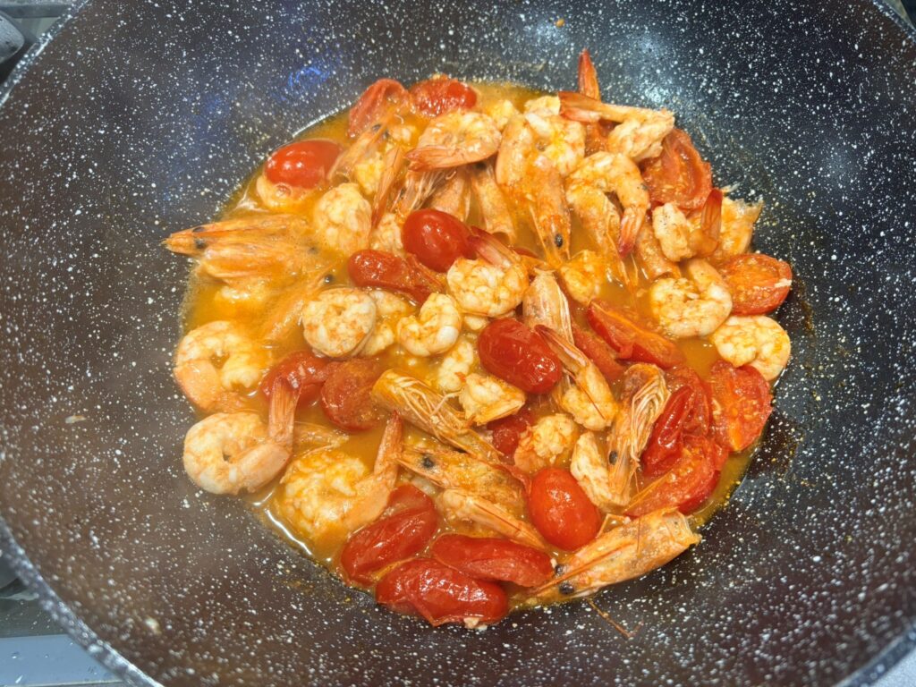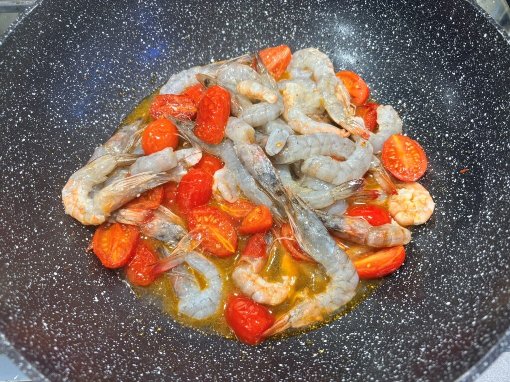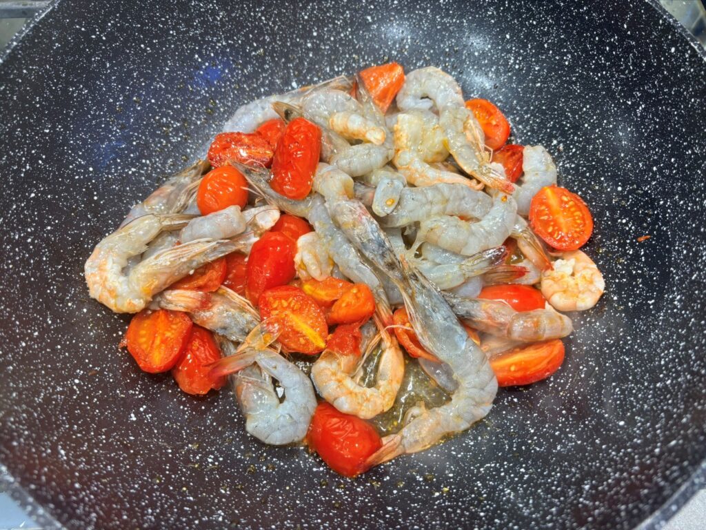 Aggiungete le mazzancolle pulite, senza il carapace , la testa e il filo nero, piu’ qualcuna lasciata intera.
