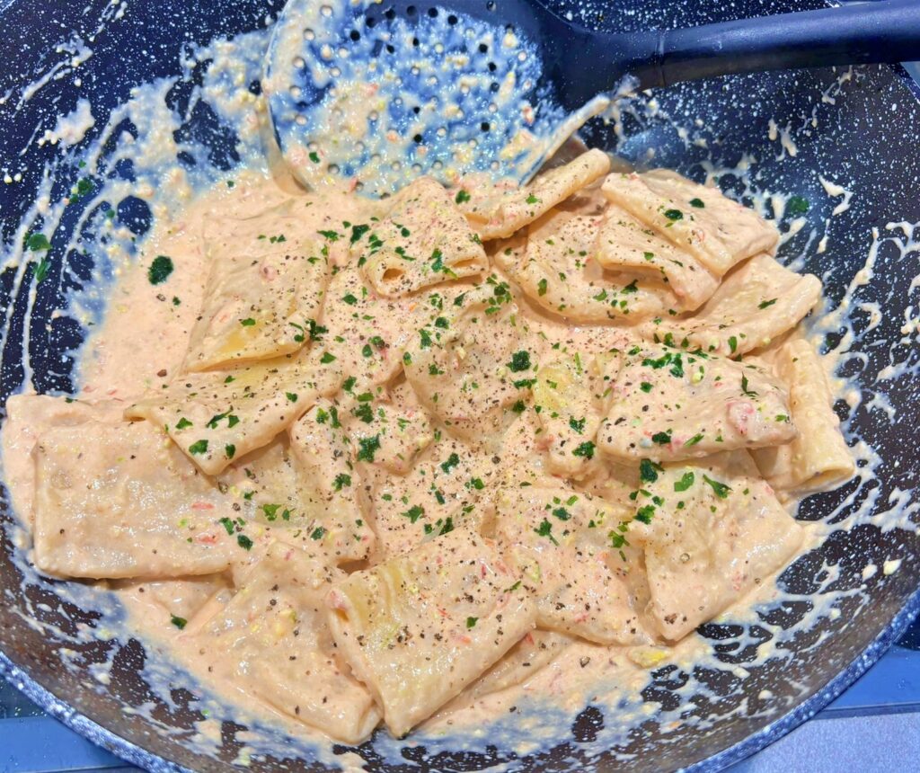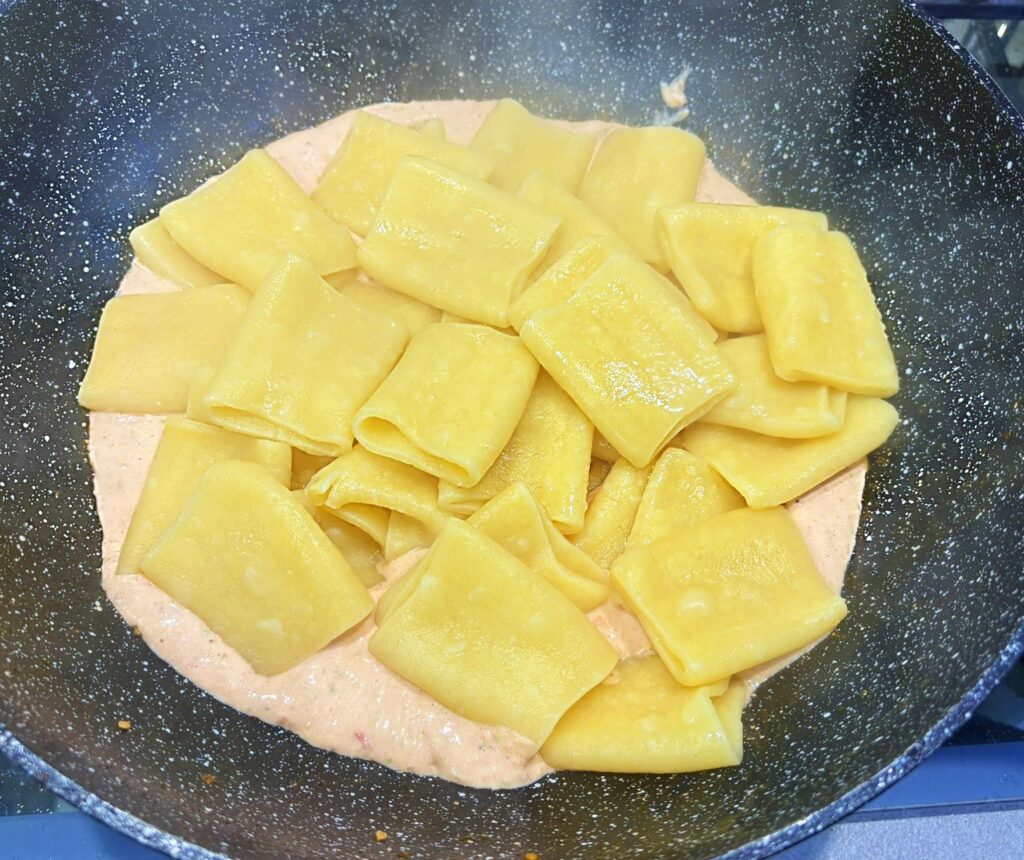 Cuocete la pasta in abbondante acqua salata, scolatela al dente e versatela in una padella capiente insieme alla crema ottenuta.