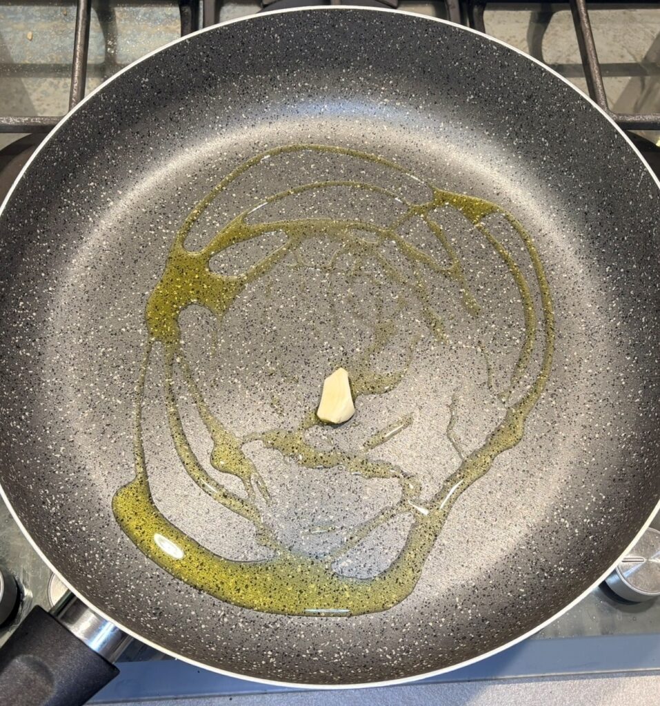 In una ampia padella scaldate un giro abbondante di olio , soffriggete l’aglio e poi toglietelo.