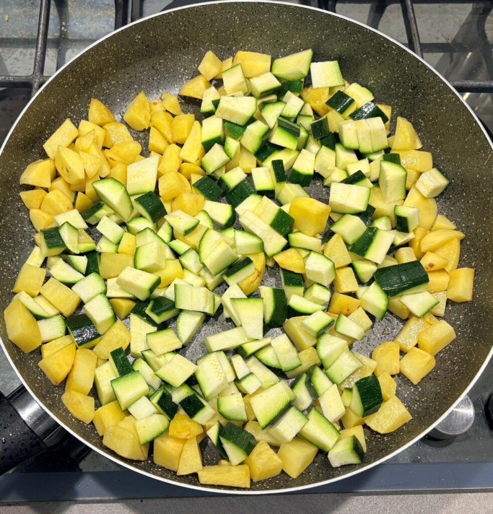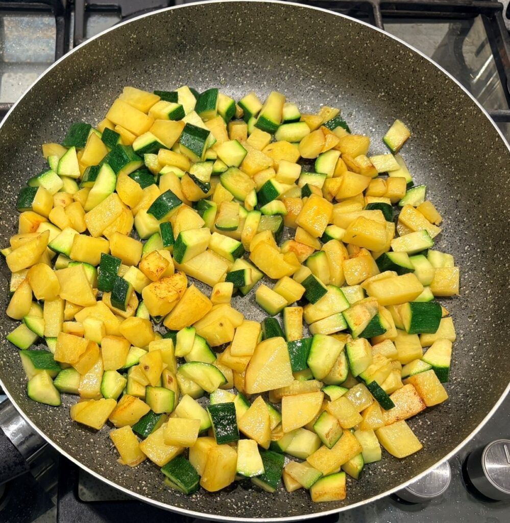 Unite le zucchine a dadini , salate e cuocete per altri 10 minuti.