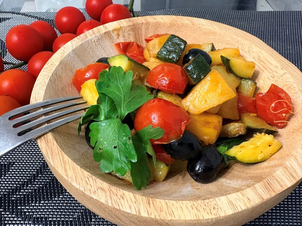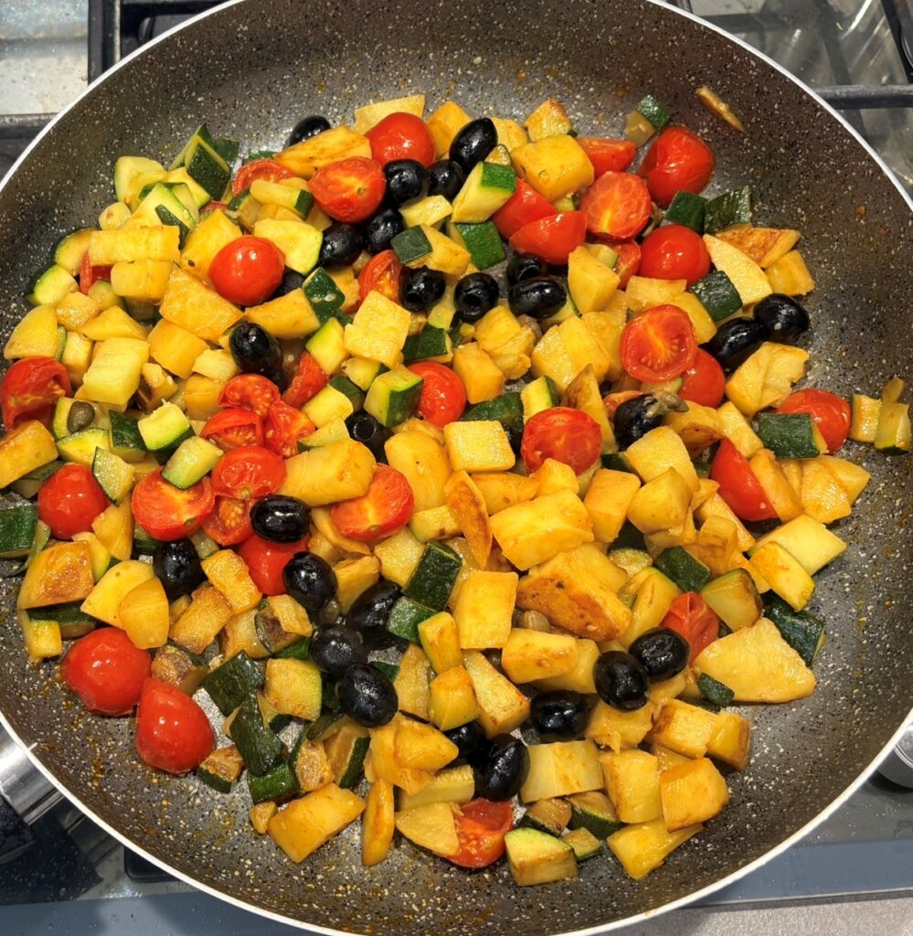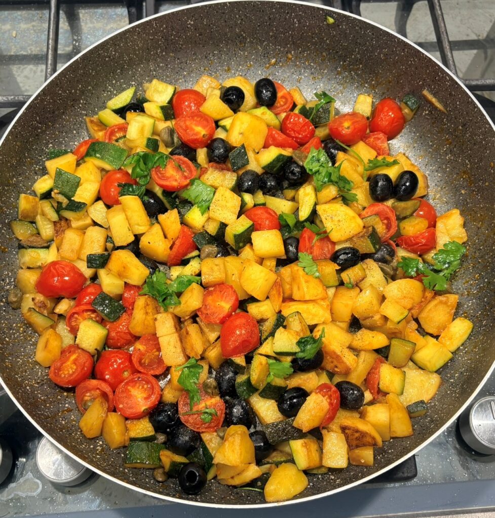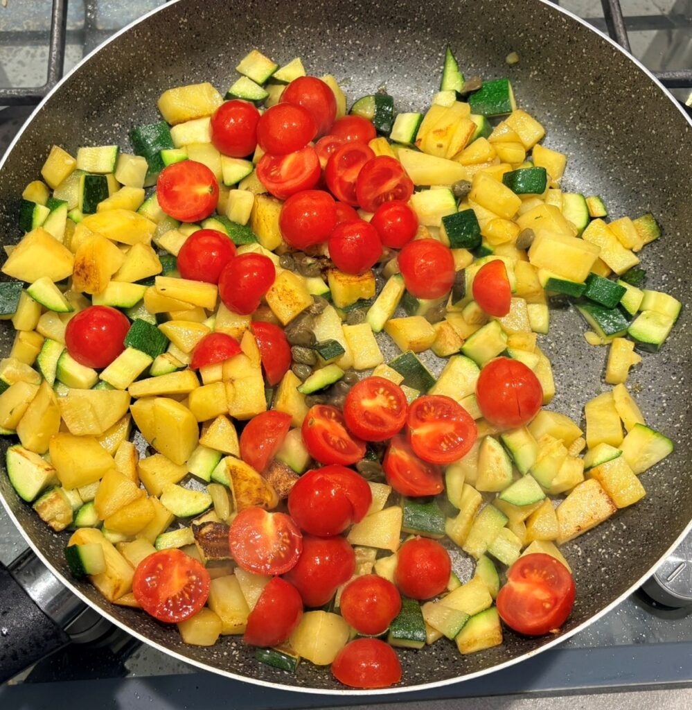Patate, zucchine, pomodorini e capperi in padella