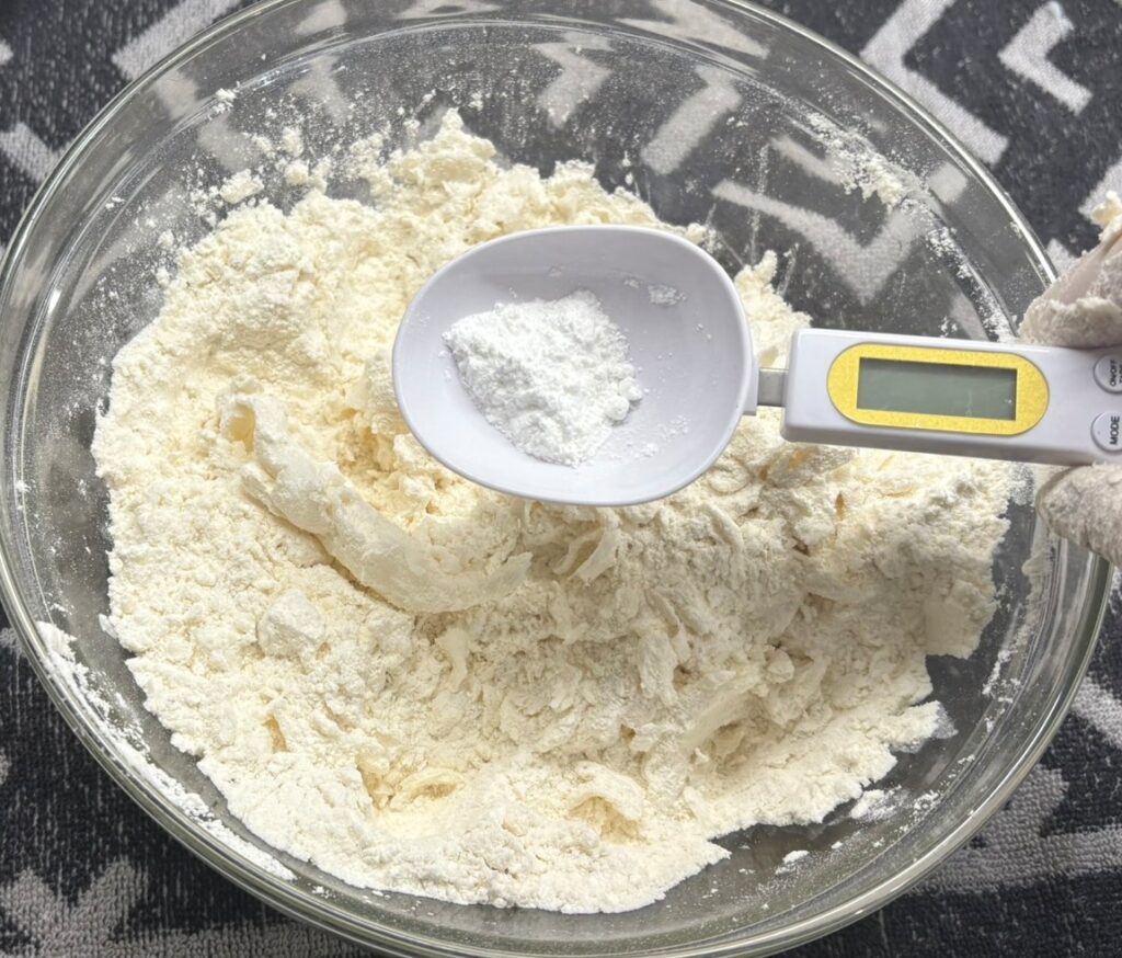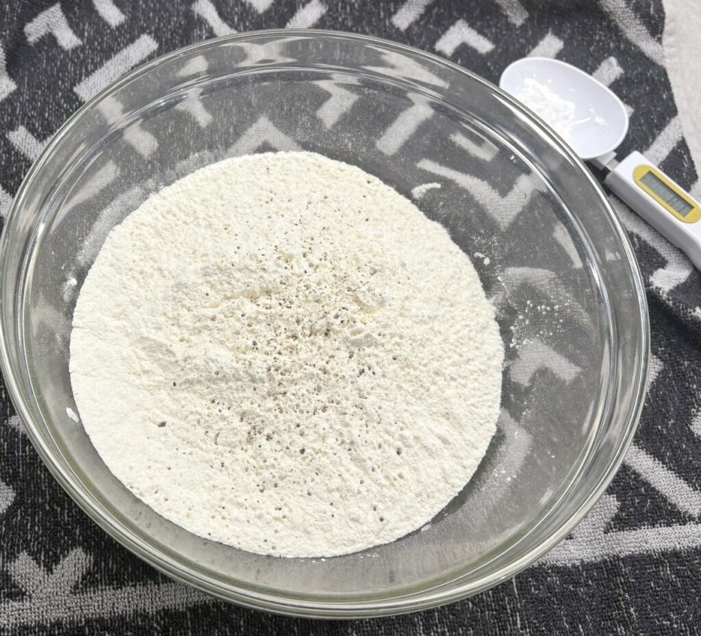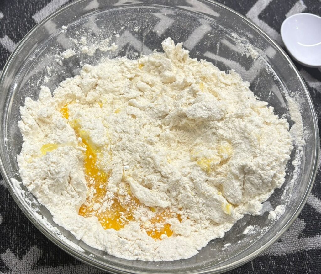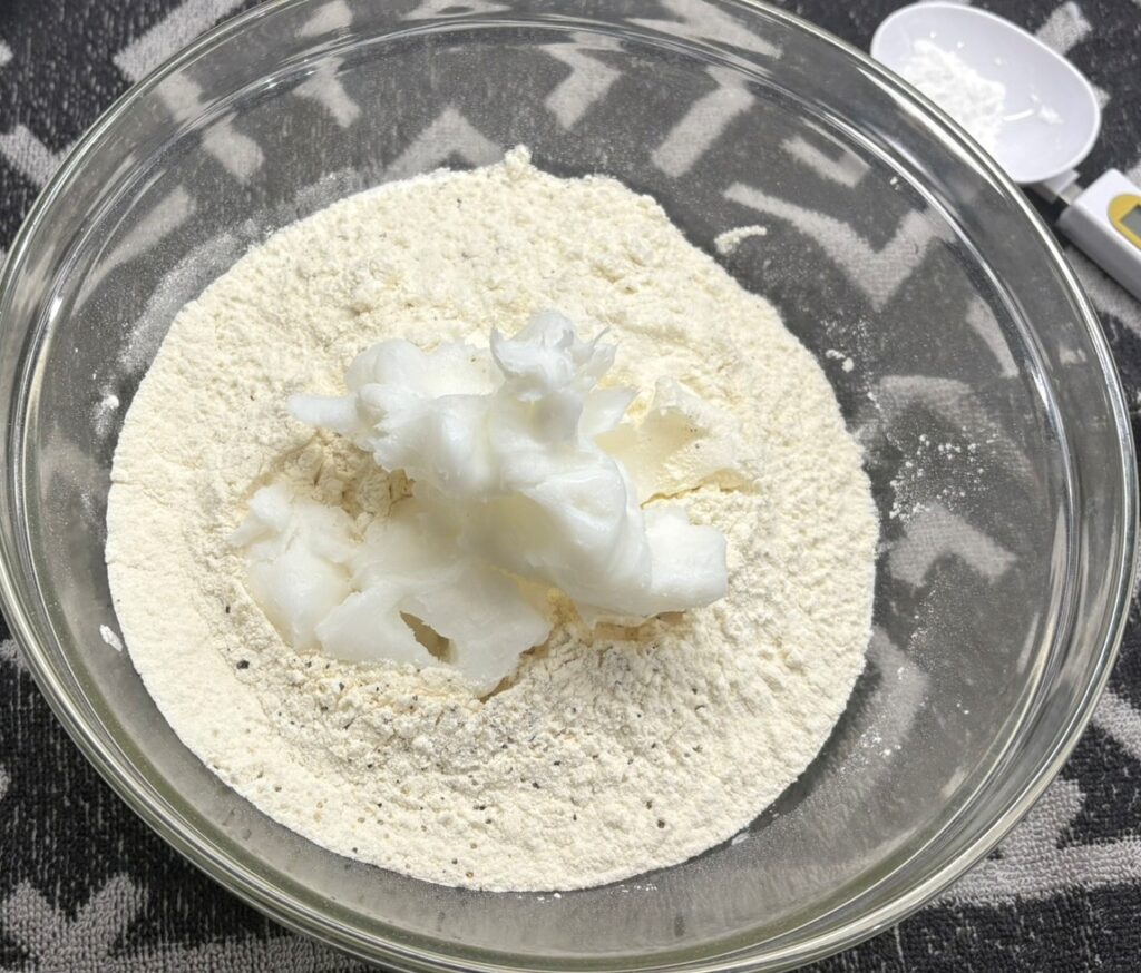 Mettete la farina in una ciotola, aggiungete il sale, il pepe e lo strutto a temperatura ambiente.