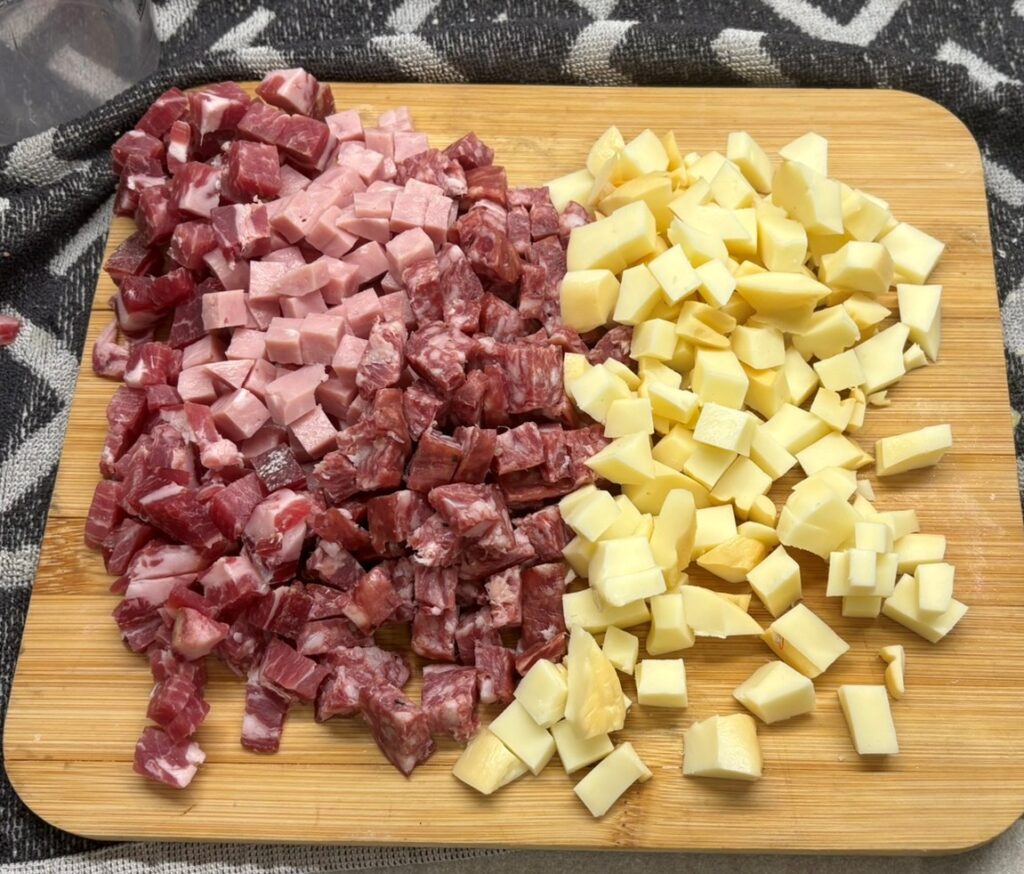 Tagliate a dadini piccoli i salumi e la scamorza e uniteli alla crema.