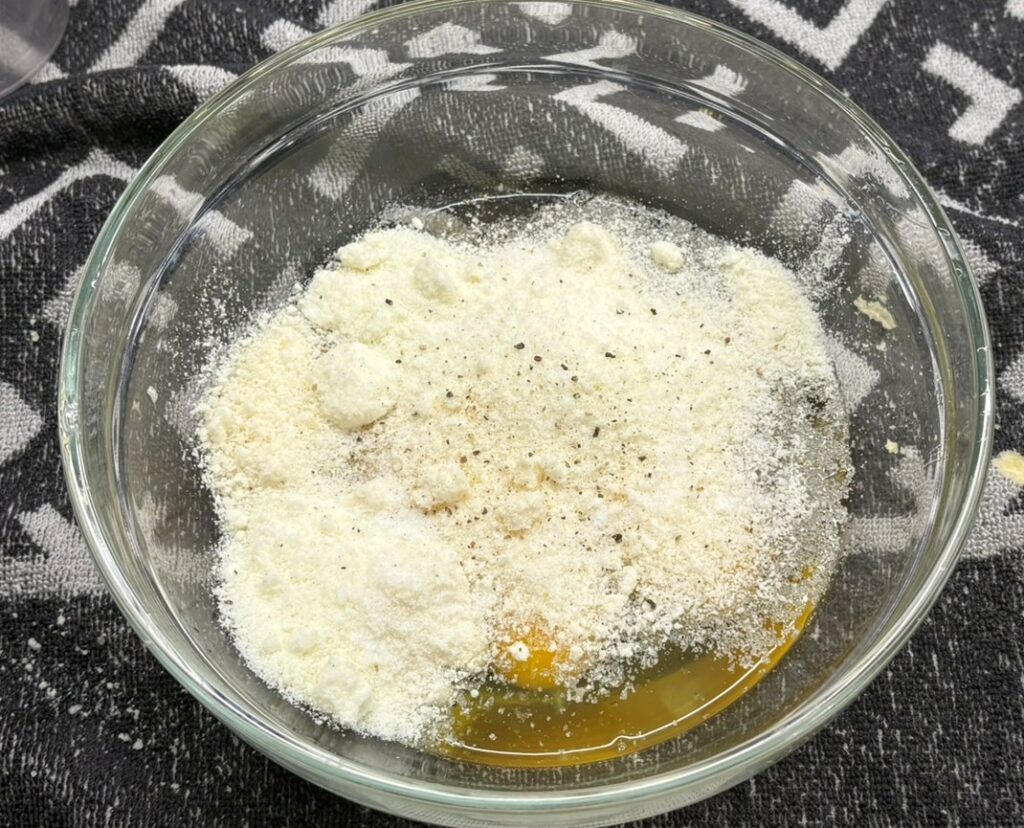 Nel frattempo in una ciotola sbattete le uova con il pecorino , il parmigiano, un pizzico di sale, di pepe e la ricotta, fino ad ottenere una cremina.