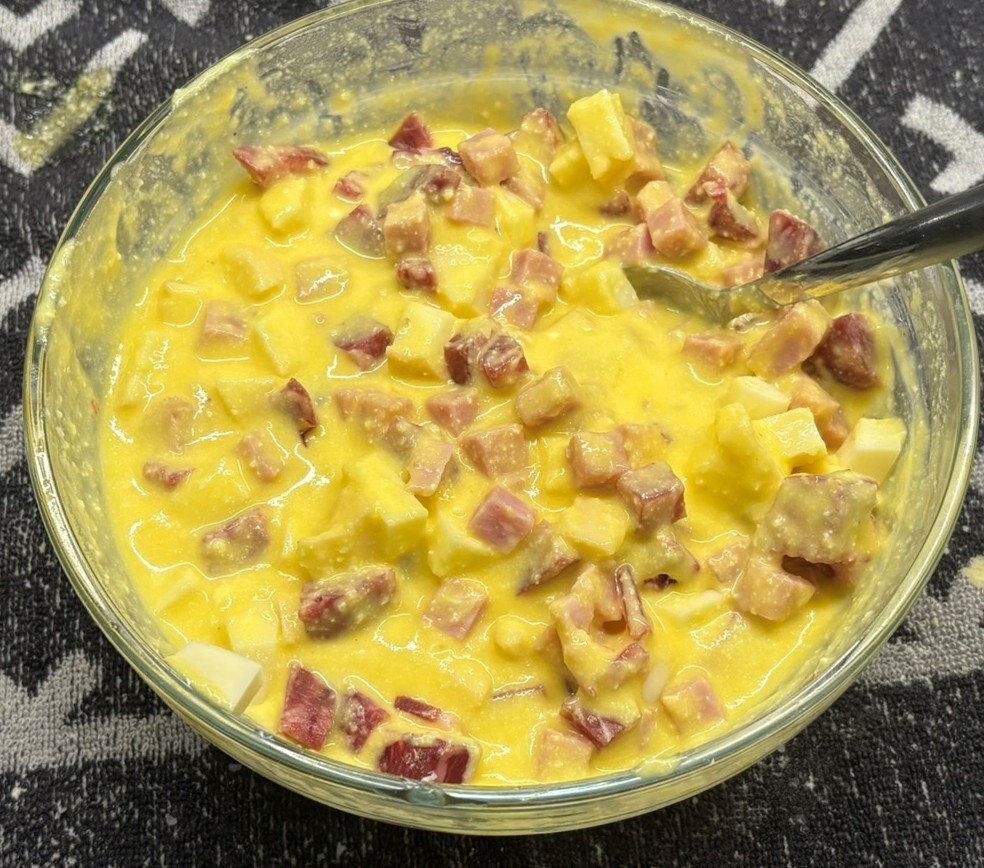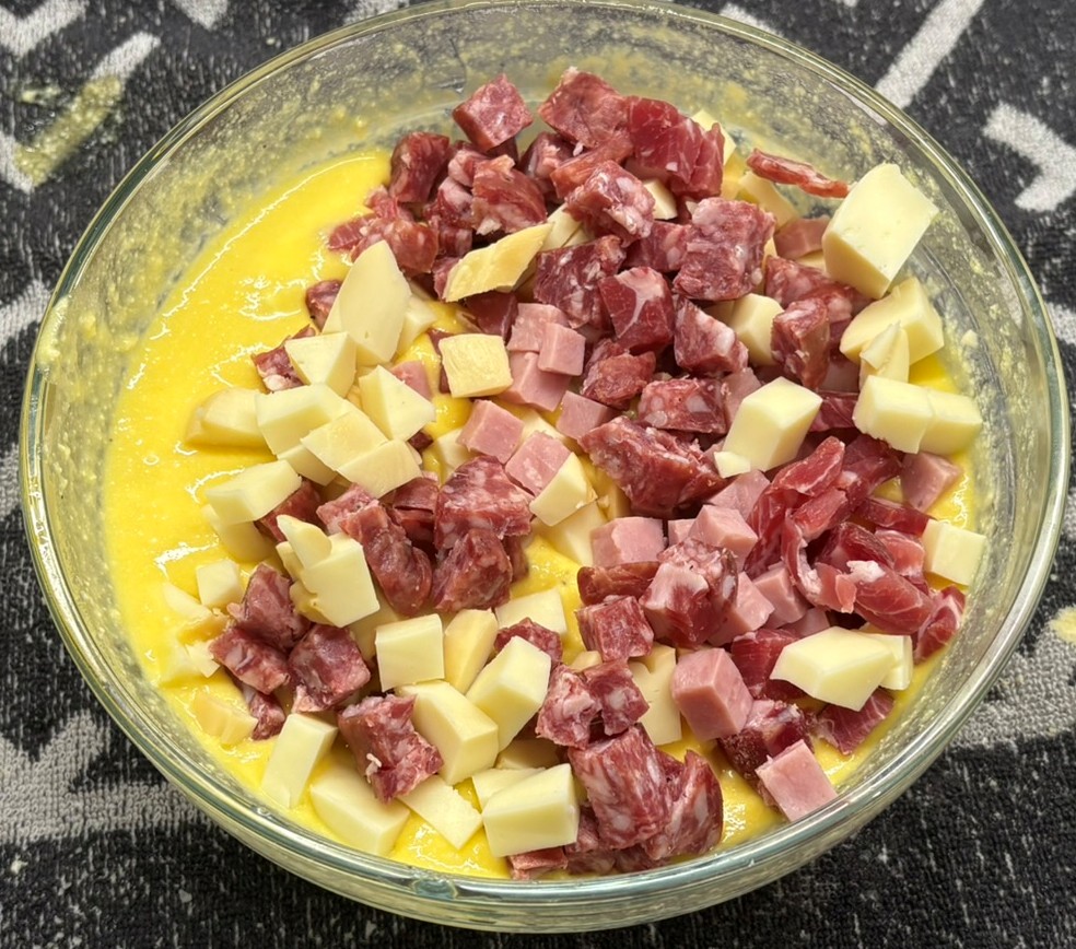 Il ripieno e’ fatto di uova sbattute che accolgono un mix di formaggi di vario tipo e salumi.