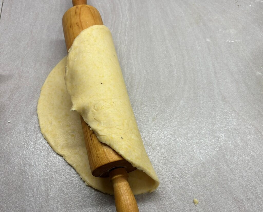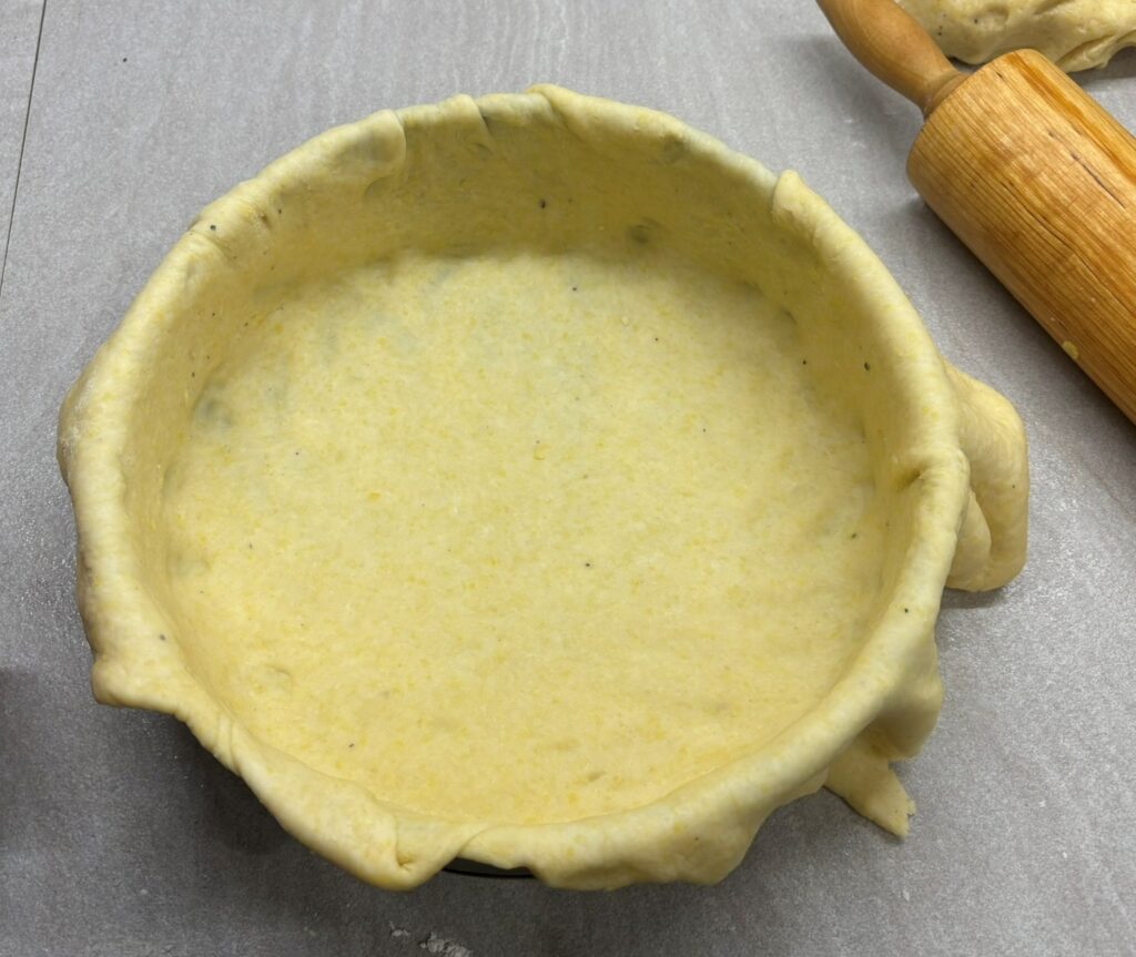 Stendete la parte piu’ grande su un piano leggermente infarinato e riponete l’impasto in uno stampo imburrato.
